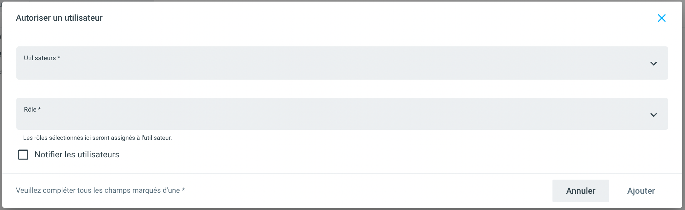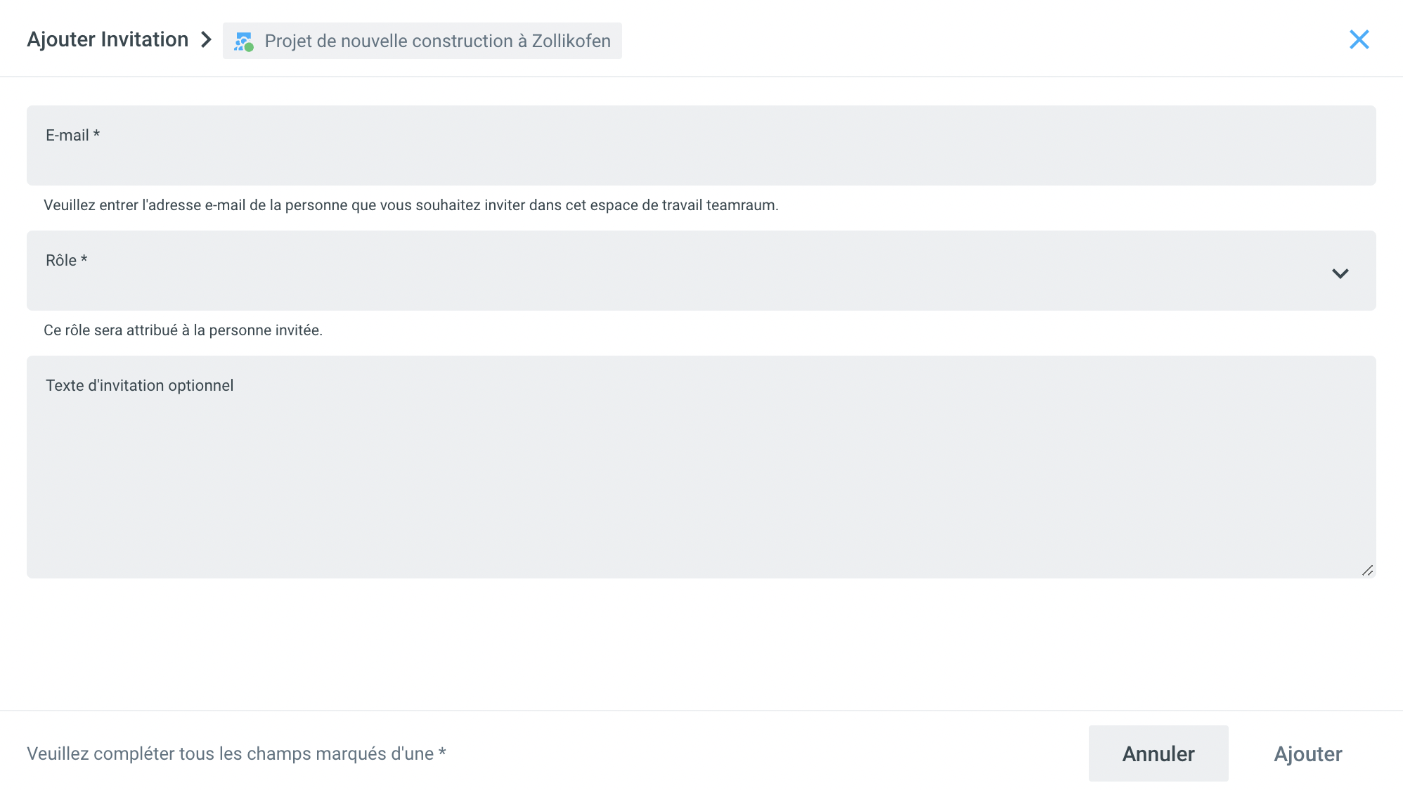 | Les participants peuvent être invités à une salle d'équipe. L'adresse e-mail ainsi que le rôle doivent être obligatoirement indiqués. L'invitation doit être acceptée pour que l'accès soit activé. ![]() |