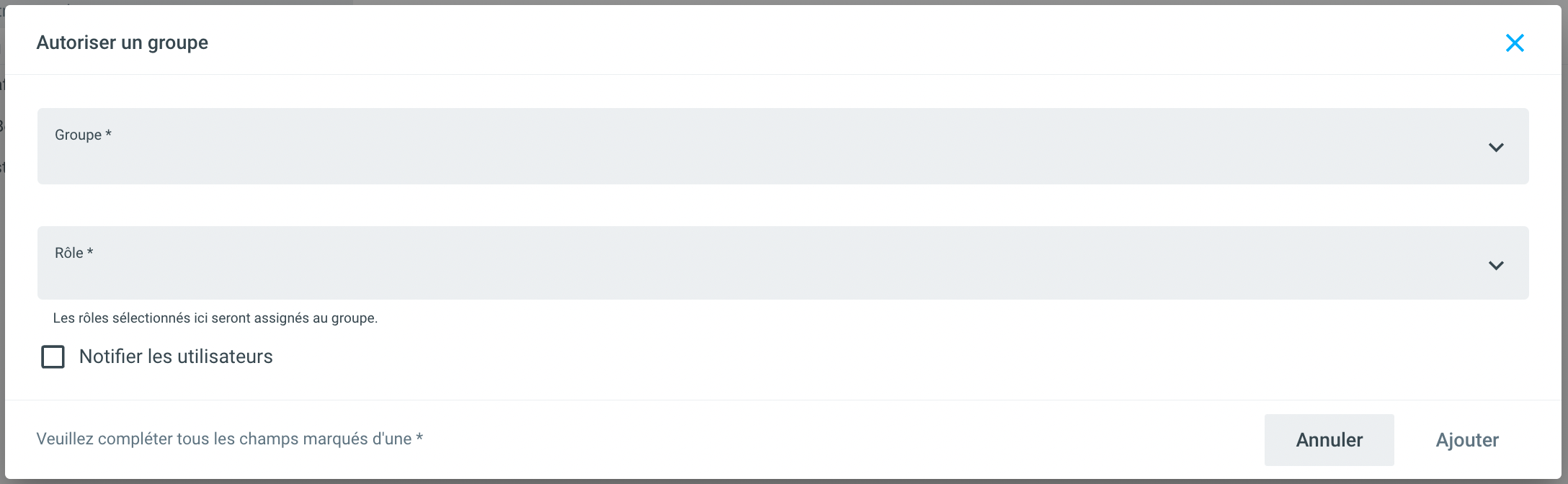 | Les groupes qui ont été saisis au préalable peuvent être autorisés à accéder à un espace d'équipe. L'option ![]() |