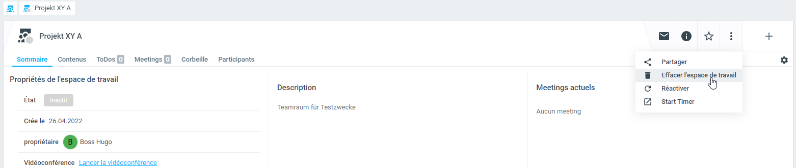 Si votre projet est terminé et que vous n'avez plus besoin de l’espace de travail, cliquez sur les trois points (= autres actions) et choisissez la commande Désactiver.