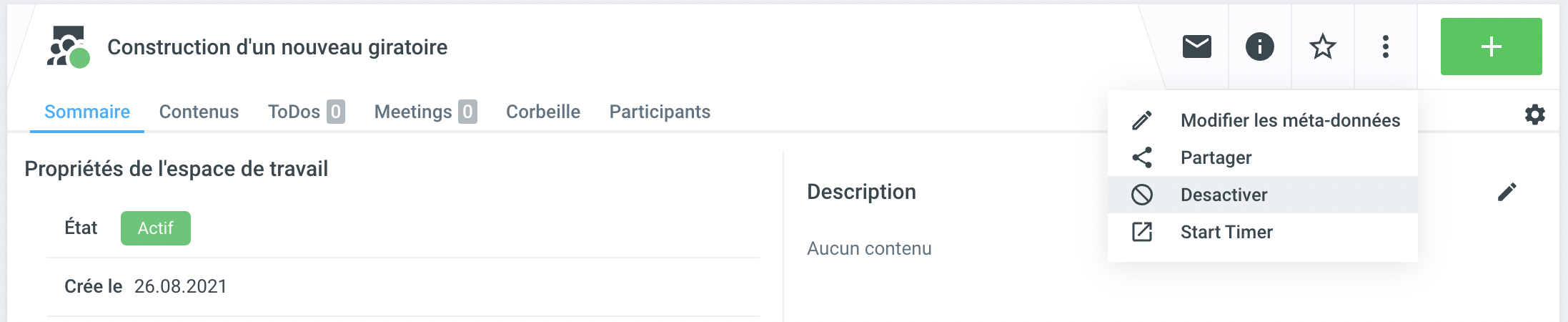 Lorsqu'un projet est terminé et que vous n'avez plus besoin de l'espace de travail, cliquez sur les trois points (= actions supplémentaires) et choisissez la commande Désactiver.