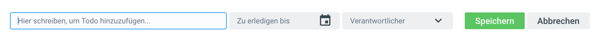 Alternativ können Sie ein Todo direkt in der Listenansicht erfassen. Klicken Sie dazu in das Feld Hier schreiben, um Todo hinzuzufügen. Sie können dann direkt in dieser Ansicht den Titel, die Frist und die verantwortliche Person erfassen.