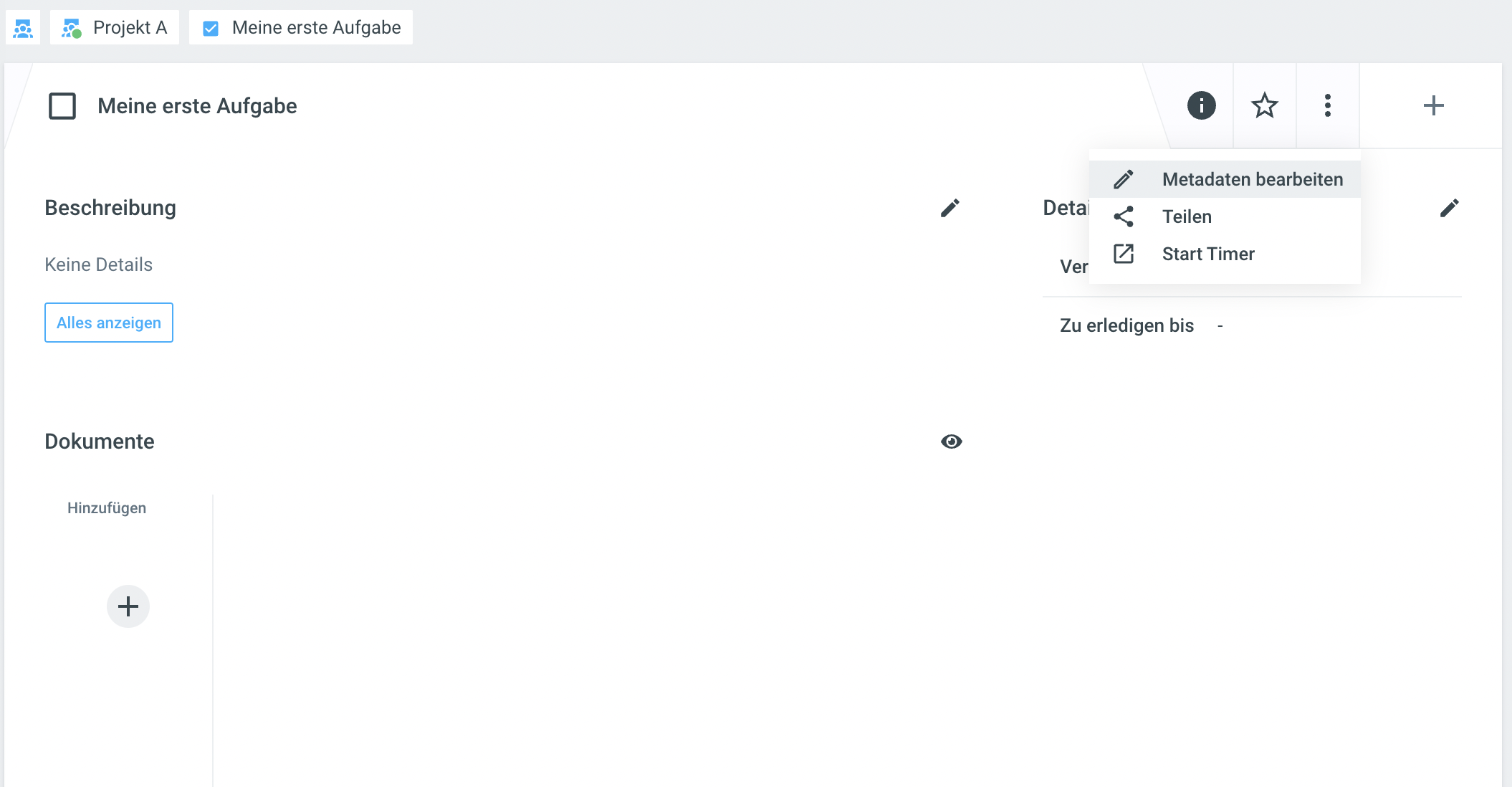 Die Details eines Todos können Sie bearbeiten, indem Sie auf das gewünschte Todo klicken und dann über die drei Punkte (=Weitere Aktionen) den Befehl Metadaten bearbeiten selektieren.