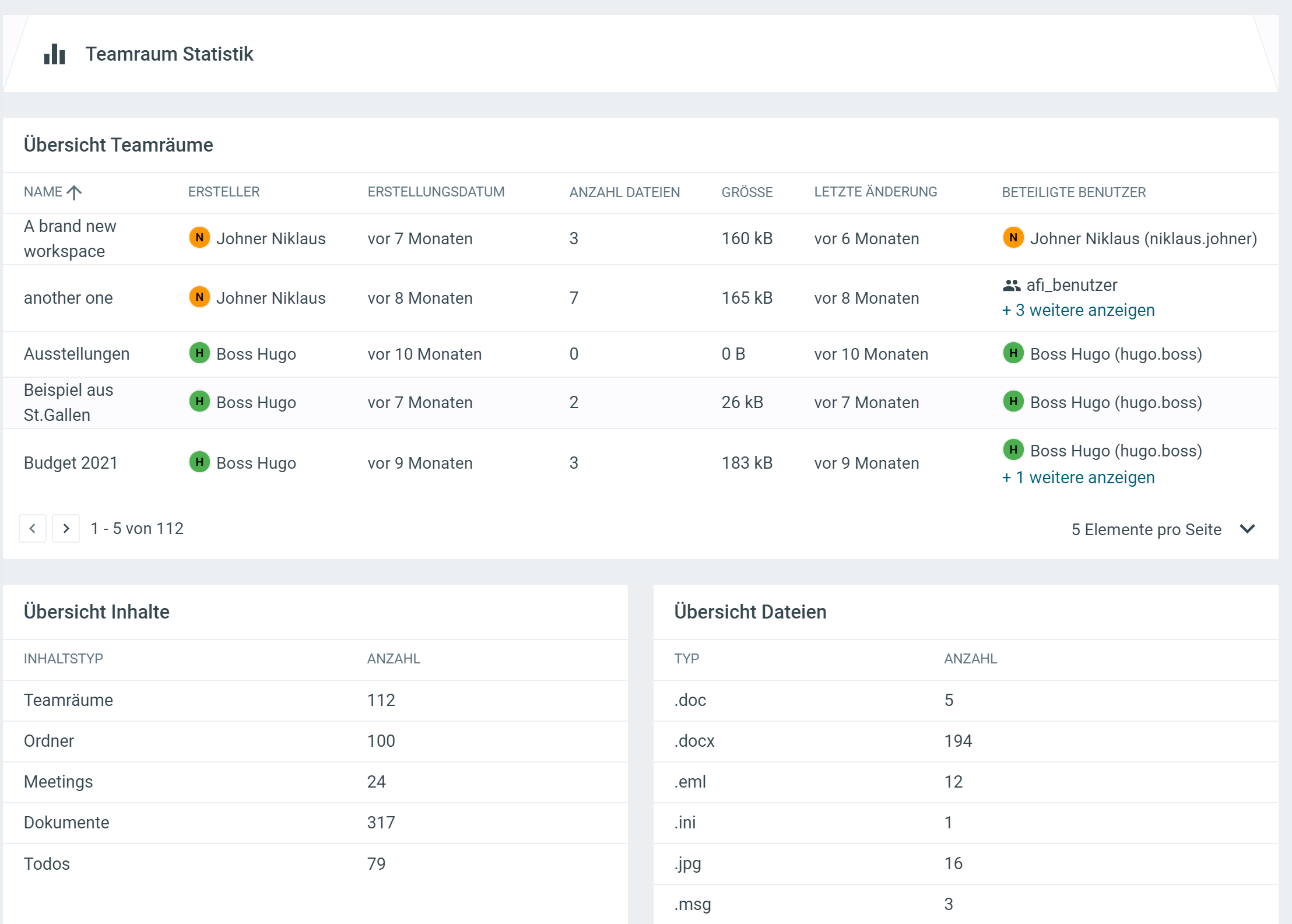 Hier finden Sie die Übersicht aller Teamräume mit den wichtigsten Angaben zu den Verantwortlichen, Anzahl Dateien, Grösse, berechtigte Personen und letzte Änderung. In den unteren zwei Tabellen sind die Anzahl Inhaltsobjekte und Dateitypen aufgelistet.