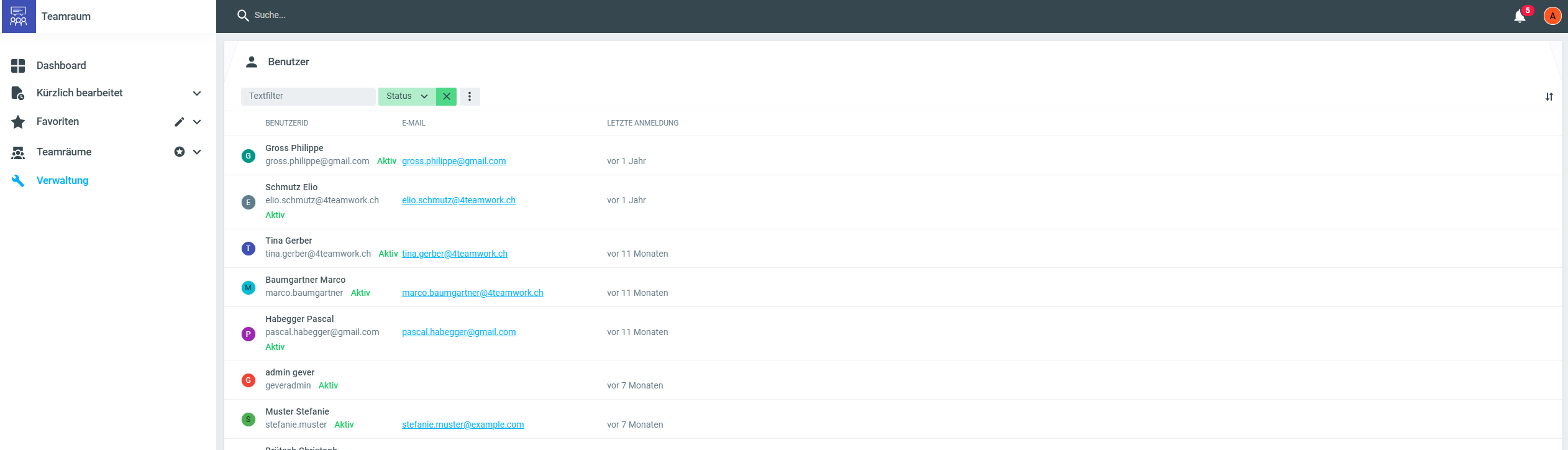 Hier finden Sie die Auflistungen aller Teamraum-Benutzenden mit Informationen zum letzten Login / letzte Anmeldung.