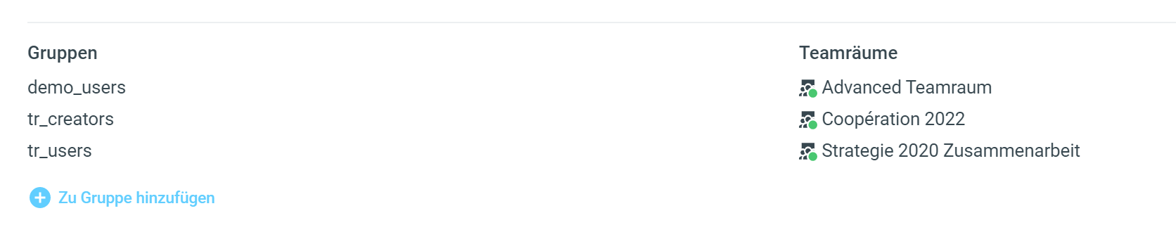 Mit Klick auf einen Benutzer erhalten Sie zusätzliche Informationen zu dessen Gruppenzugehörigkeit und sehen, bei welchen Teamräumen die Person berechtigt ist. Sie können hier auch gleich eine neue Gruppe berechtigen.