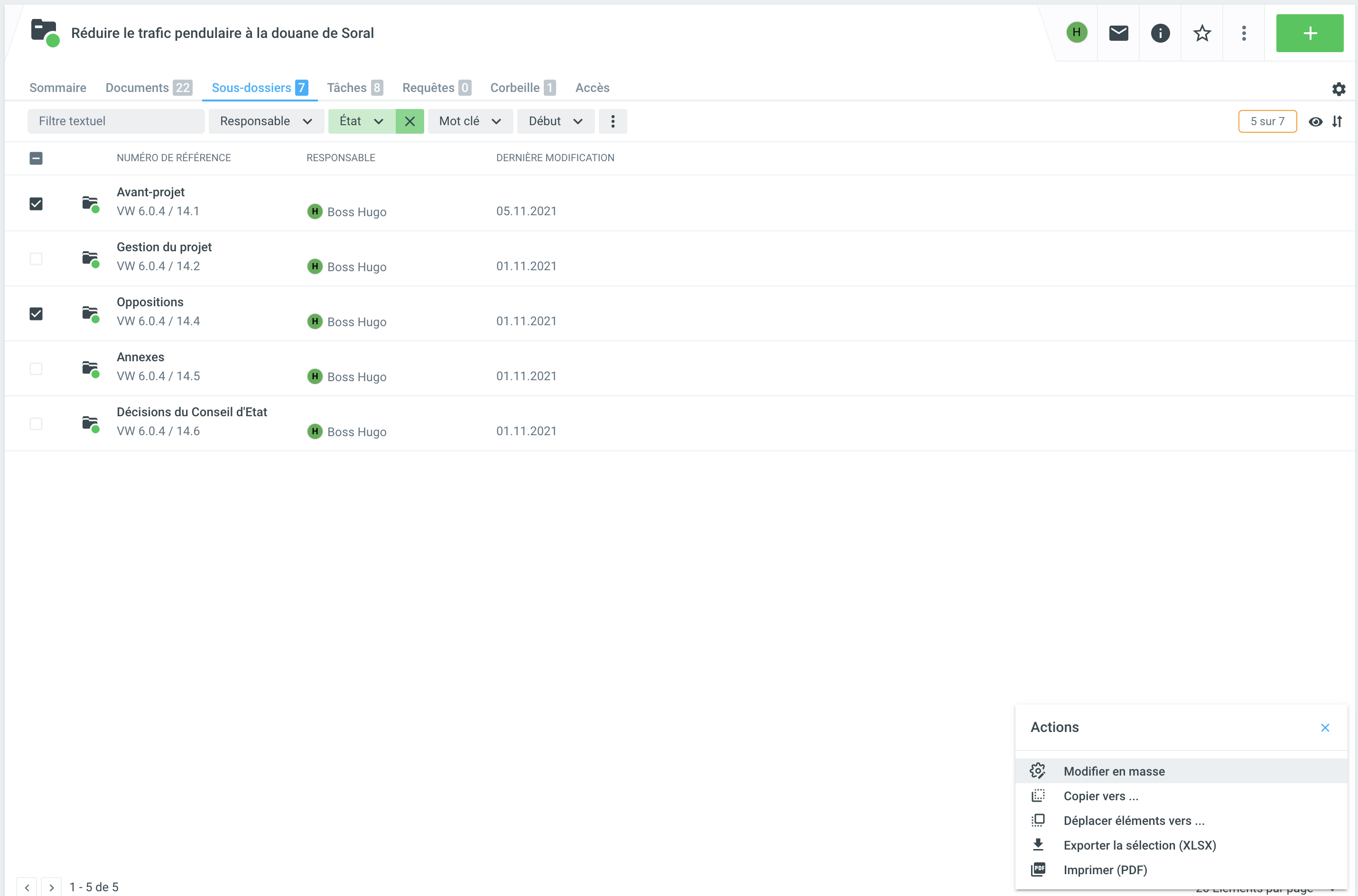 L'action Modifier en masse permet d'éditer un nombre illimité de documents en une seule étape. Sélectionnez les documents correspondants et cliquez sur Modifier en masse sous Actions à droite.