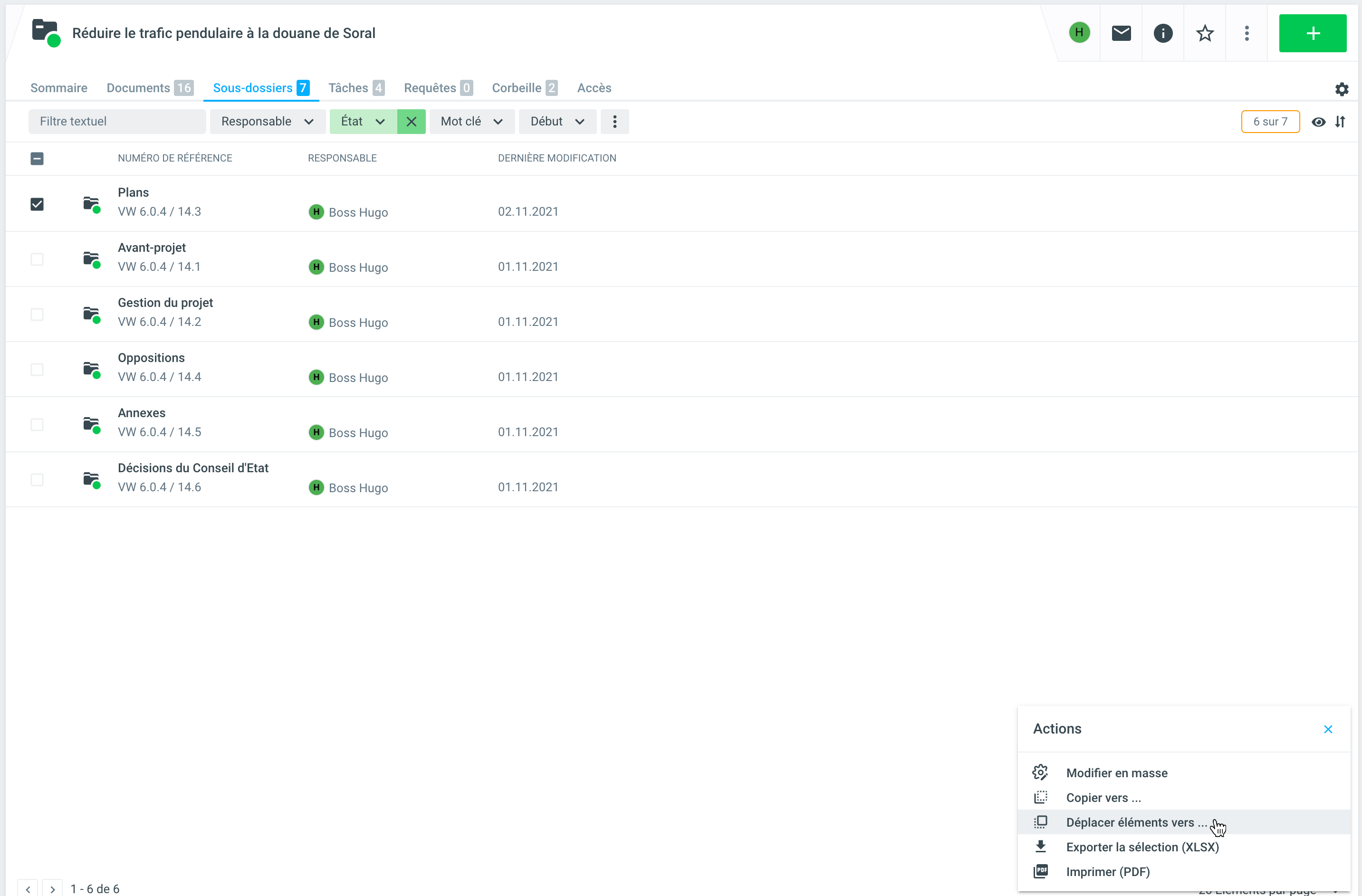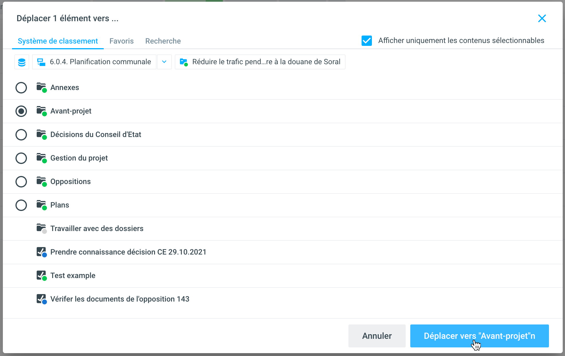 Vous pouvez ensuite sélectionner un nouvel emplacement dans le système de classement. Bien entendu, seules les rubriques sont possibles pour les dossiers. Lorsque vous avez sélectionné la rubrique souhaitée, cliquez sur Déplacer vers 1.1.1 Votre rubrique cible. Le dossier est ensuite déplacé.