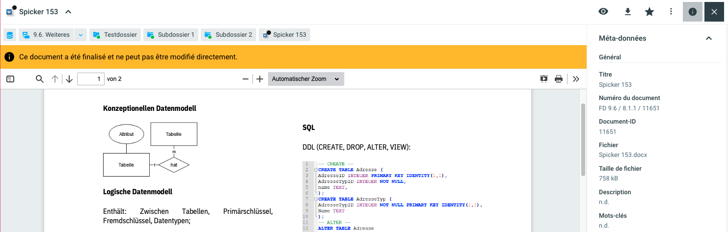 Après avoir traité un document et l'avoir à nouveau archivé, il est possible de finaliser le document. Ce changement de statut a pour conséquence qu'il n'est plus possible de modifier le document. Les documents finalisés peuvent cependant être à nouveau modifiés et adaptés via l'option Réviser.