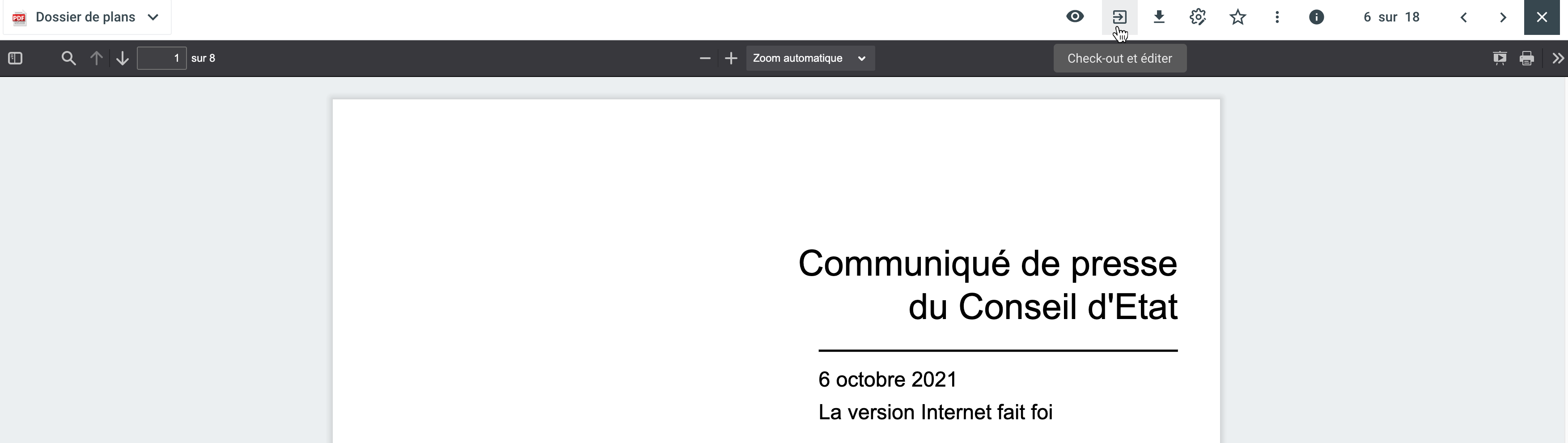 Vous pouvez extraire et éditer un document en cliquant sur le symbole du rectangle avec la flèche (check-out et éditer).