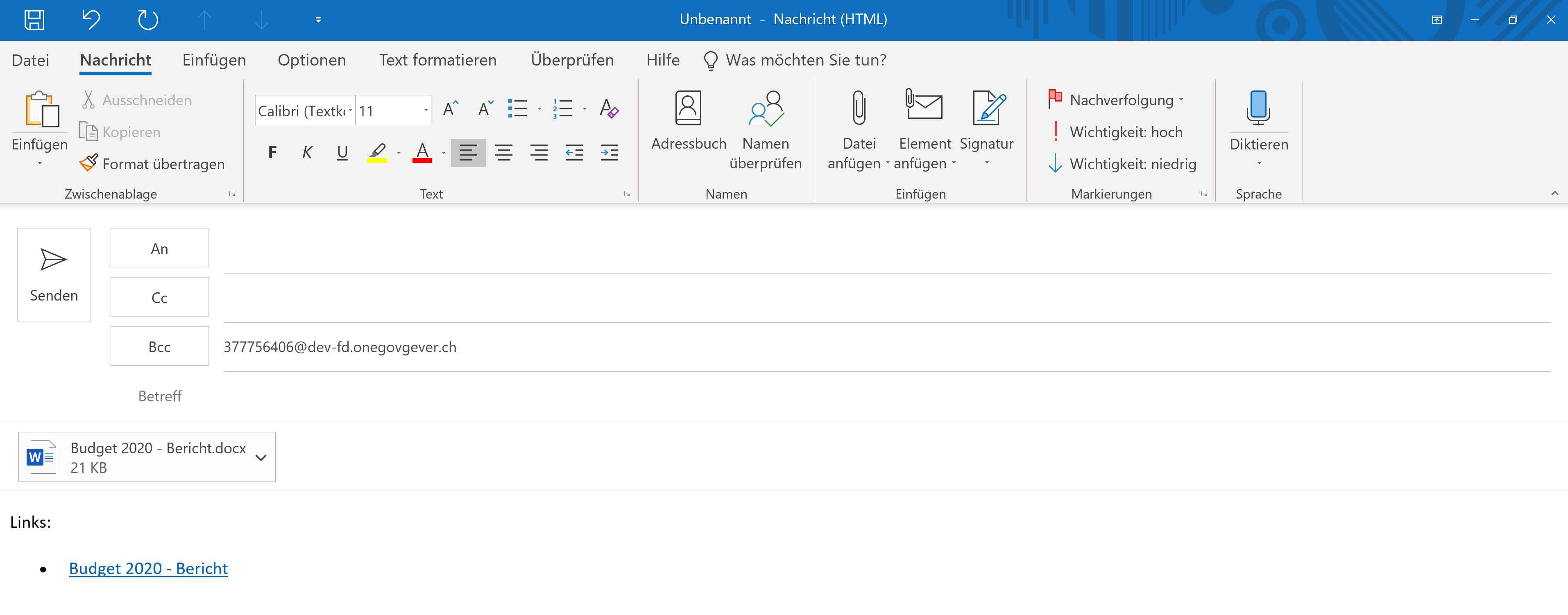 En cliquant sur le symbole de la lettre dans la vue détaillée d'un document, celui-ci peut être envoyé à l'aide du programme de courriel standard. En cliquant dessus, une courte boîte de dialogue s'ouvre. Vous pouvez y définir quels éléments seront envoyés par e-mail (fichier original en annexe et/ou lien) et si l'e-mail correspondant doit être classé directement dans le dossier par envoi d'e-mail. L'envoi du mail est documenté dans le journal.