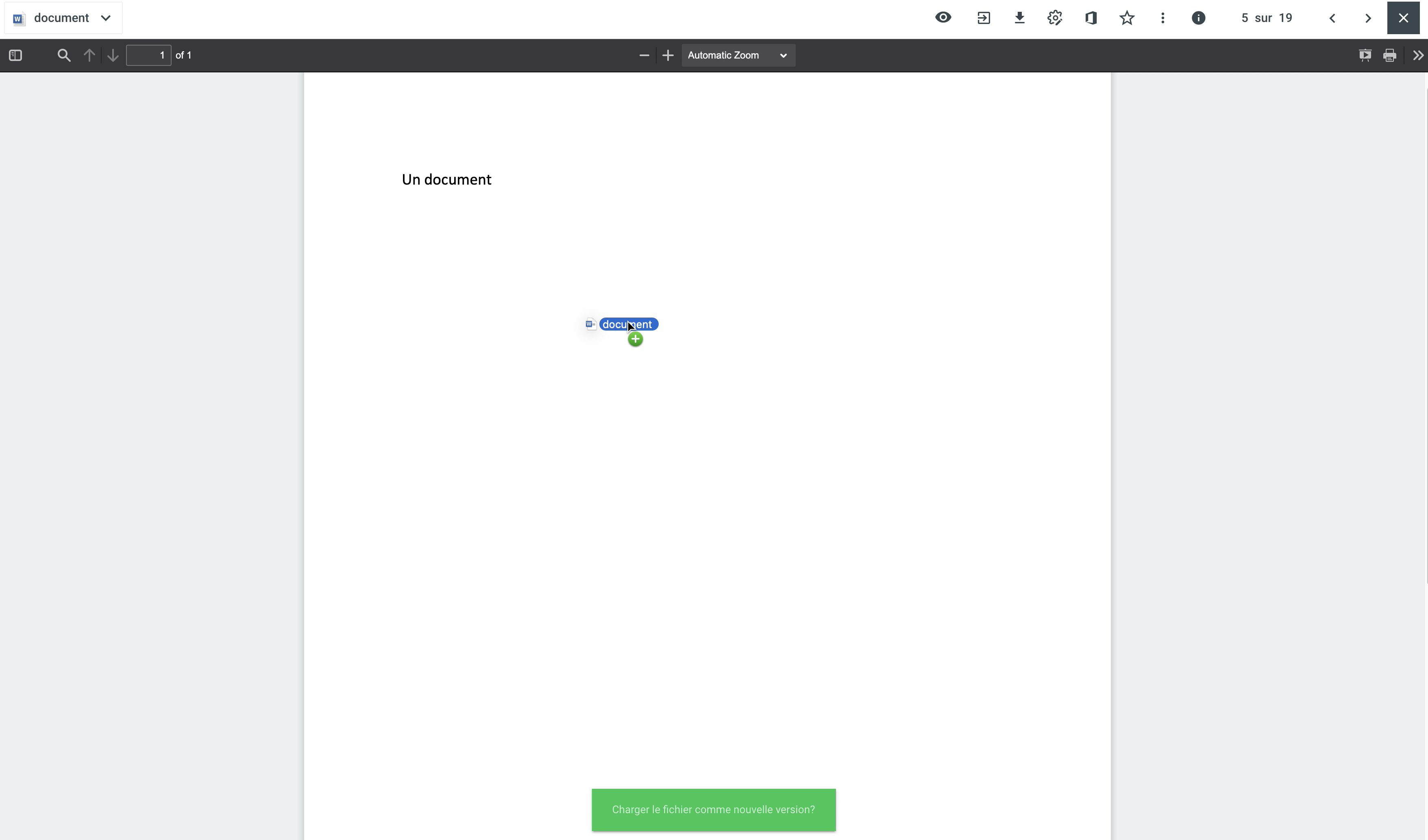 Le document apparaît comme enregistré. Le fichier déposé est répertorié comme une nouvelle version dans les informations sur la version.