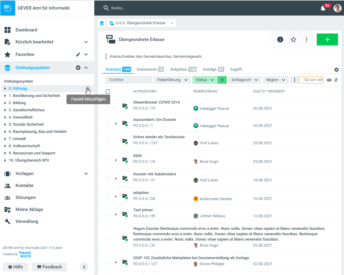 Im Menübereich Ordnungssystem wird das hinterlegte Ordnungssystem angezeigt. Wählt man dabei den obersten Punkt Ordnungssystem an, werden alle Dossiers angezeigt, die gemäss den Berechtigungen des Benutzenden angezeigt werden dürfen.