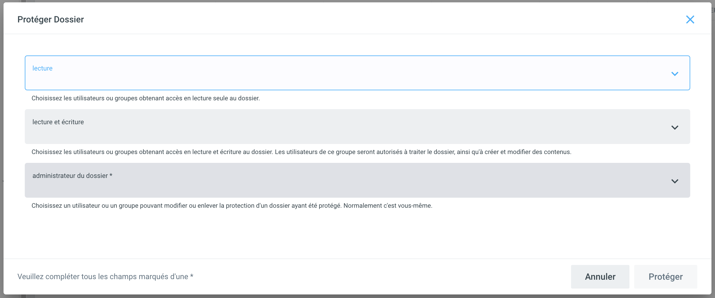 Le champ administrateur du dossier et au moins un des champs lecture et lecture et écriture doivent être remplis, sinon les autorisations ne seront pas définies correctement.