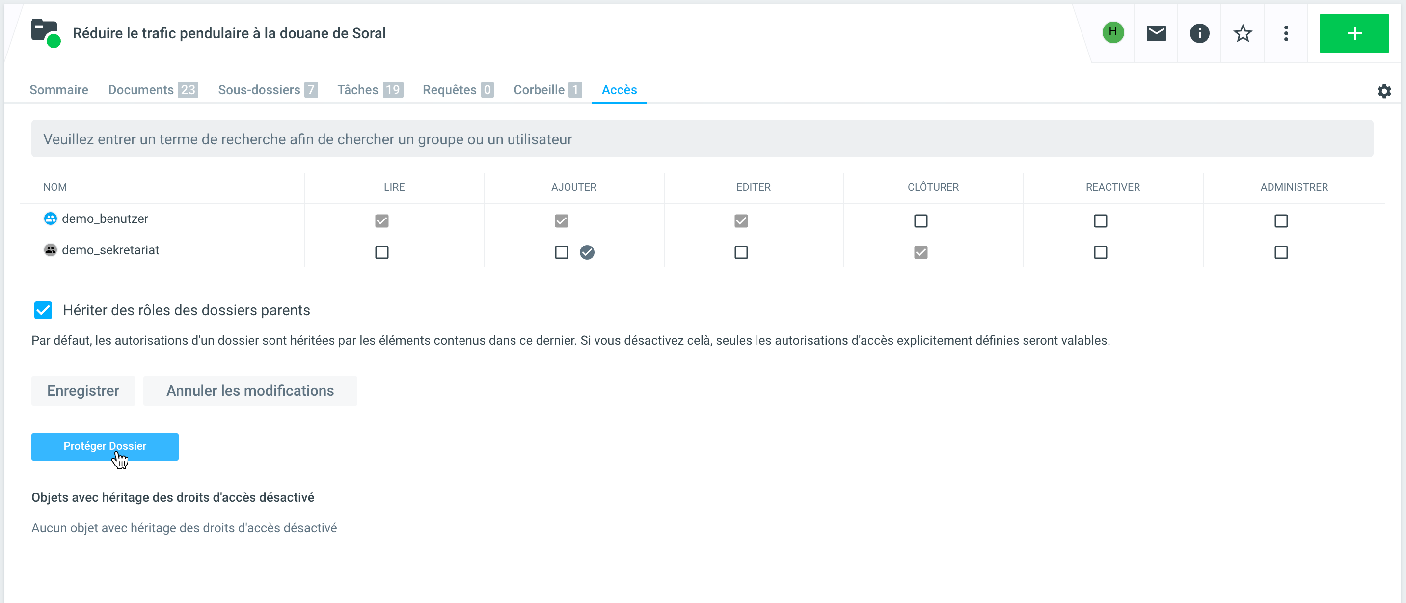 Si vous sélectionnez cette fonction, vous pouvez réinitialiser les rôles de lecture, de lecture et d'écriture et d'administrateur de dossier pour le dossier en question. Toutes les autorisations existantes dans ce dossier sont alors supprimées et remplacées par les entrées nouvellement définies.