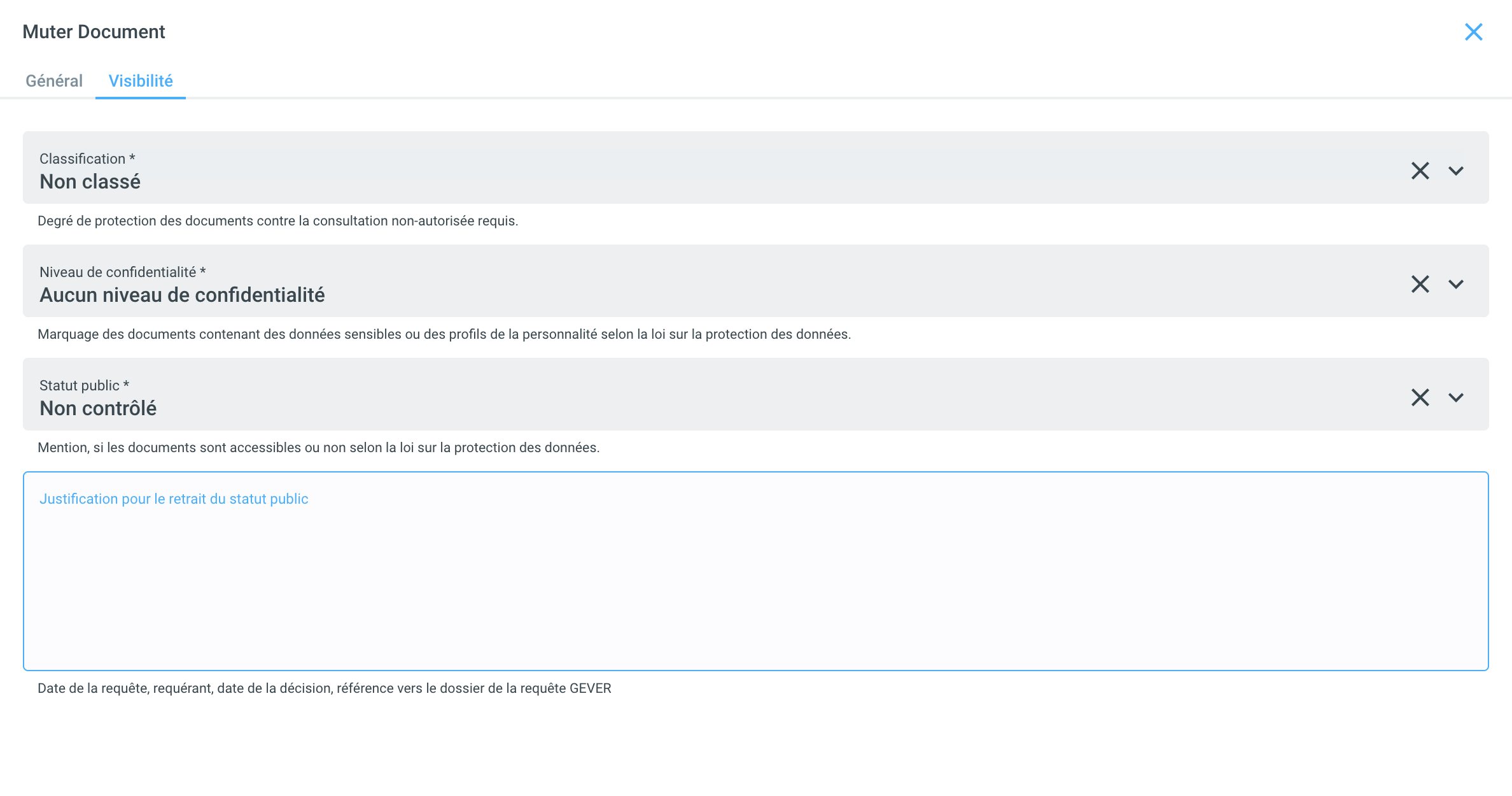 Pour les dossiers fermés, la mutation du statut public est une exception. Sinon, aucune autre métadonnée ou autre modification ne peut être apportée aux documents ou aux dossiers.