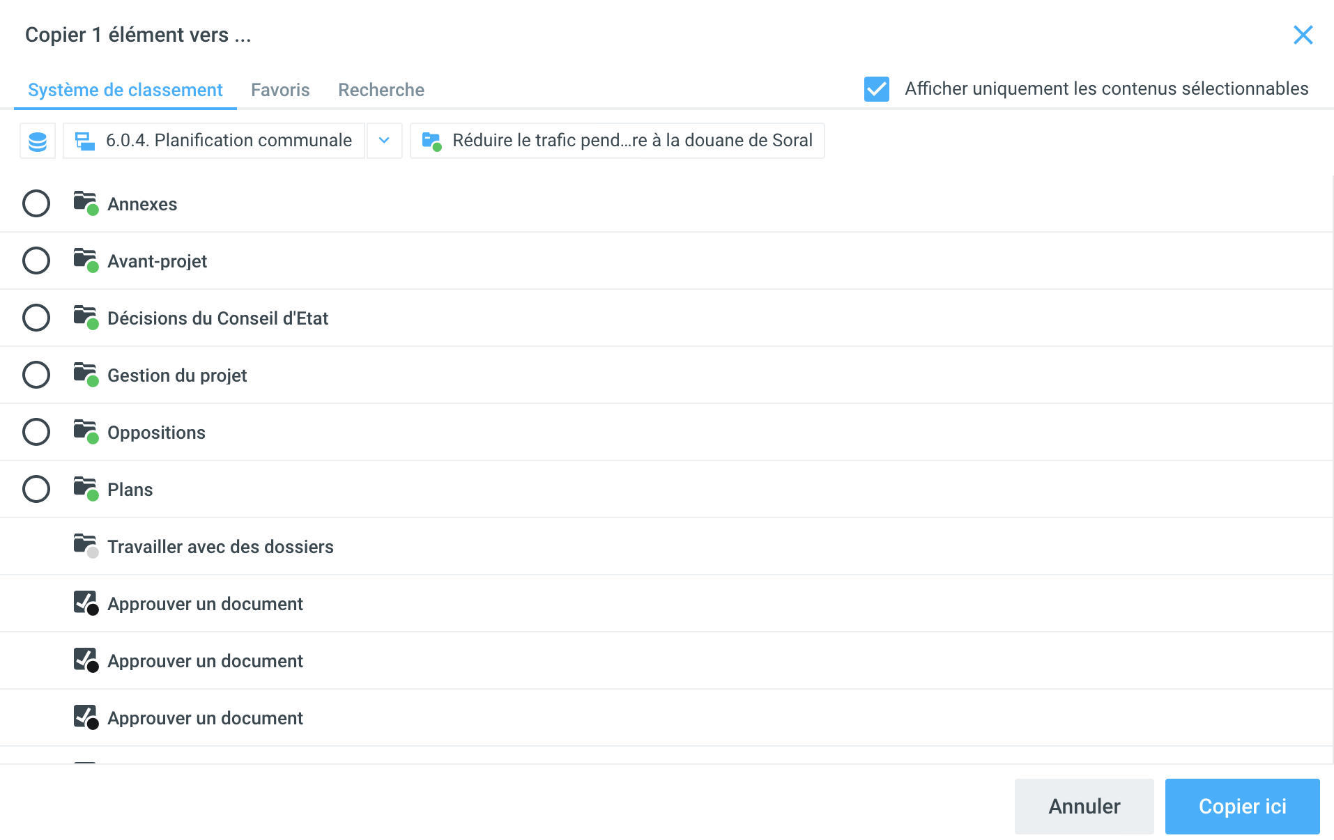 Cliquez sur le document à copier dans la liste des documents et sélectionnez Copier dans le menu contextuel en bas à droite. Sélectionnez ensuite la destination dans la fenêtre qui apparaît.