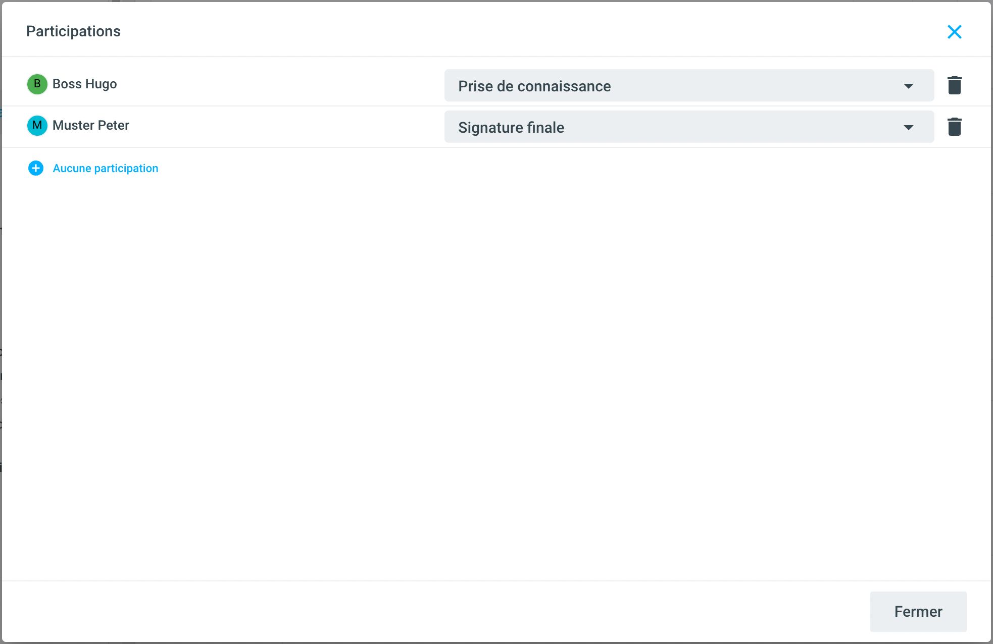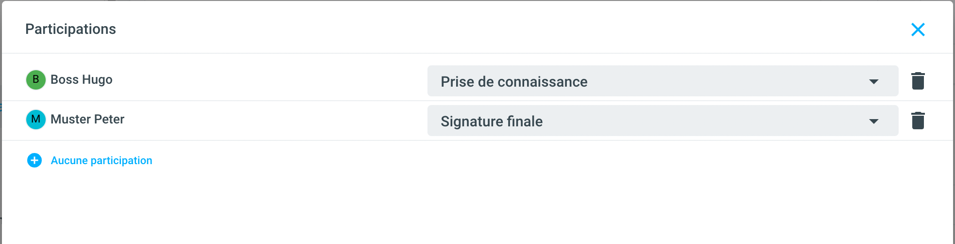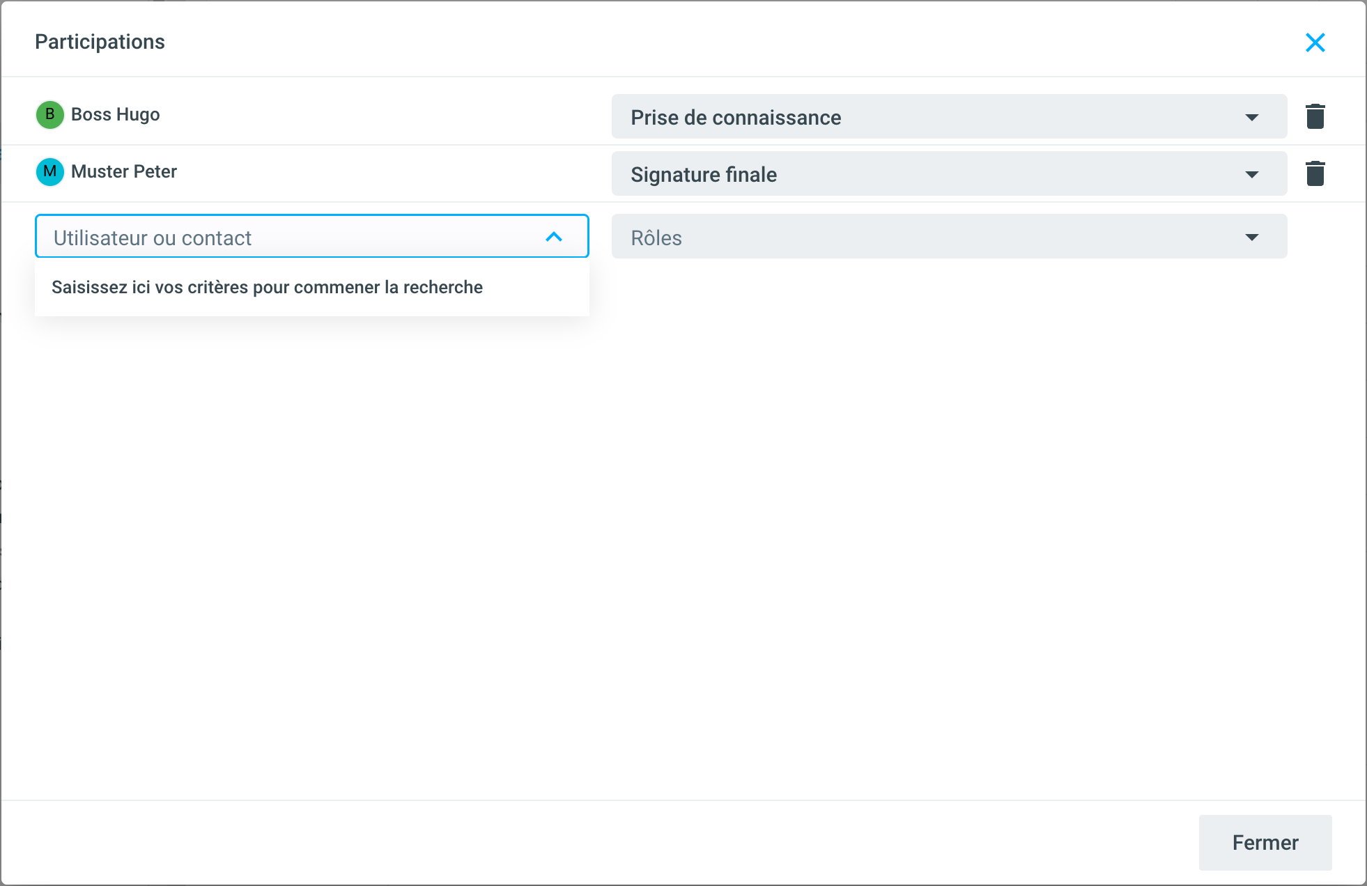 Tapez le nom souhaité et sélectionnez le rôle. Par défaut, les rôles accusé de prise de connaissance, participation et signature finale sont stockés. Cette sélection peut être étendue à volonté.