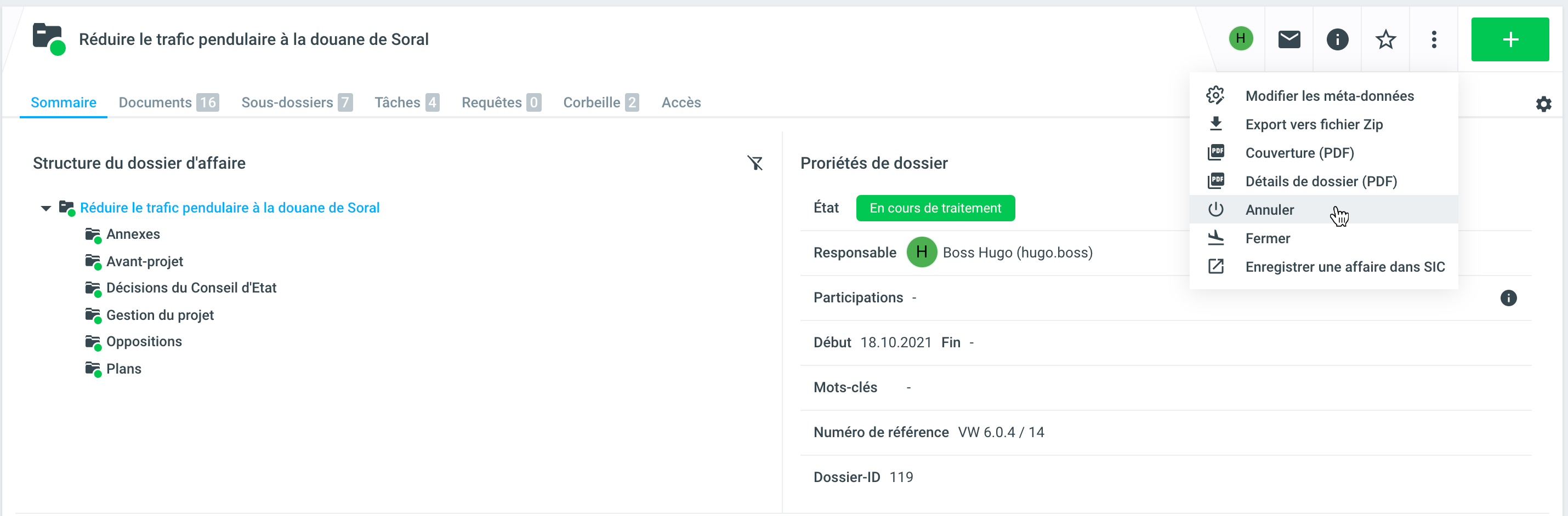 Si un dossier a été ouvert par erreur, il peut être annulé en cliquant sur les trois points (=Plus d'actions) et ensuite sur Annuler. Les dossiers annulés ne peuvent plus être édités. Les personnes disposant de l'autorisation appropriée peuvent réactiver les dossiers annulés.