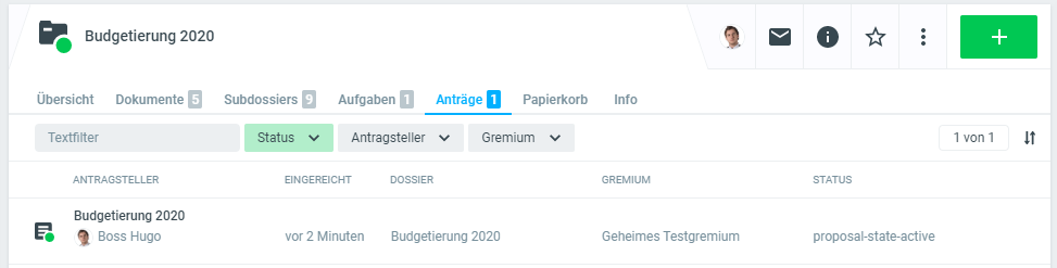Es stehen Ihnen in einem Dossier unter dem Reiter Anträge standardmässig eine Reihe von Filtern zur Verfügung: