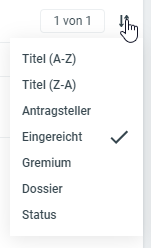 Standardmässig wird eine Antragsauflistung nach dem Wert Eingereicht sortiert. Sie können dies mit Klick auf die beiden Pfeile rechts oben in der Auflistung beliebig ändern.