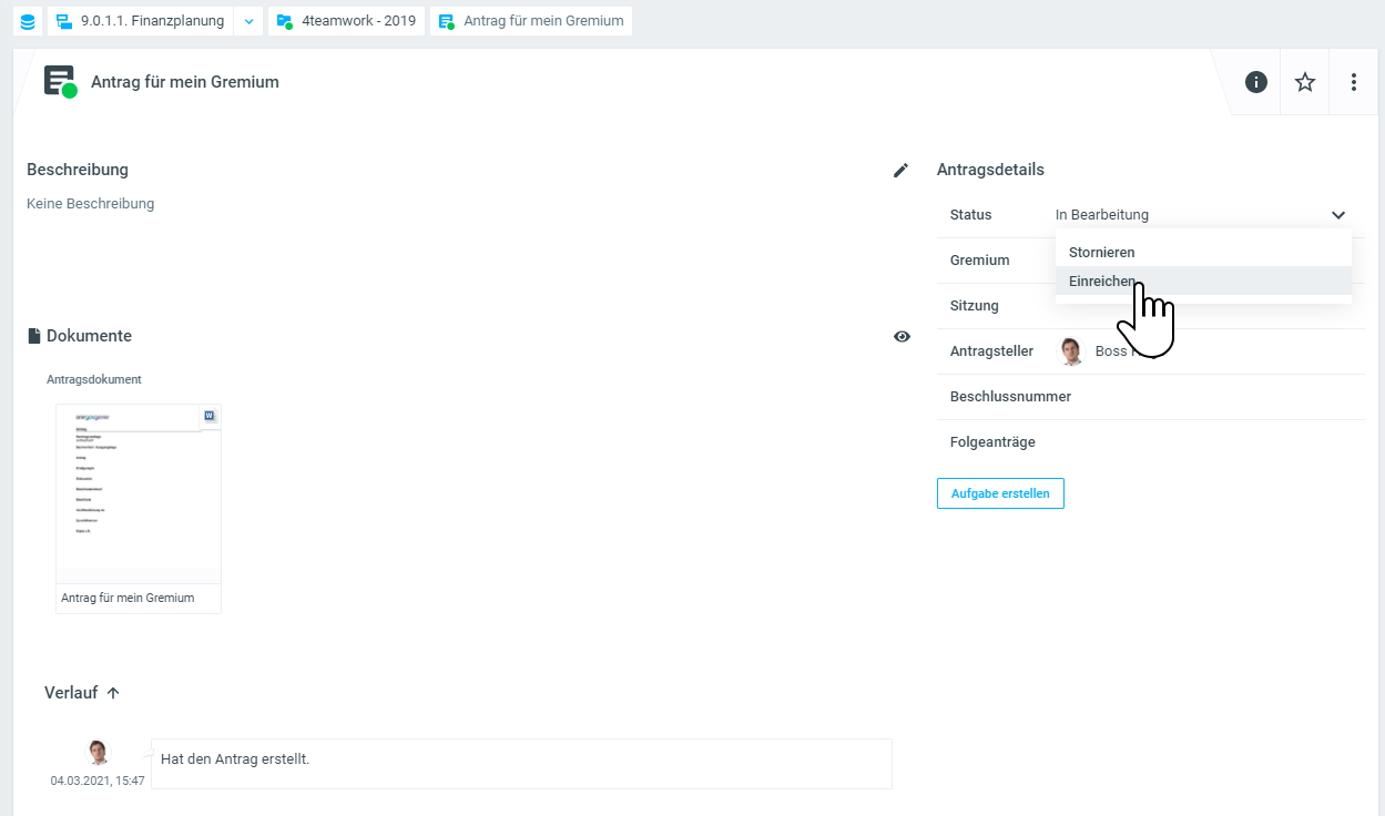 Ist der Antrag bereit zur Einreichung, wählen Sie im Bereich Antragsdetails unter Status das Dropdown-Menü und klicken Sie auf Einreichen.