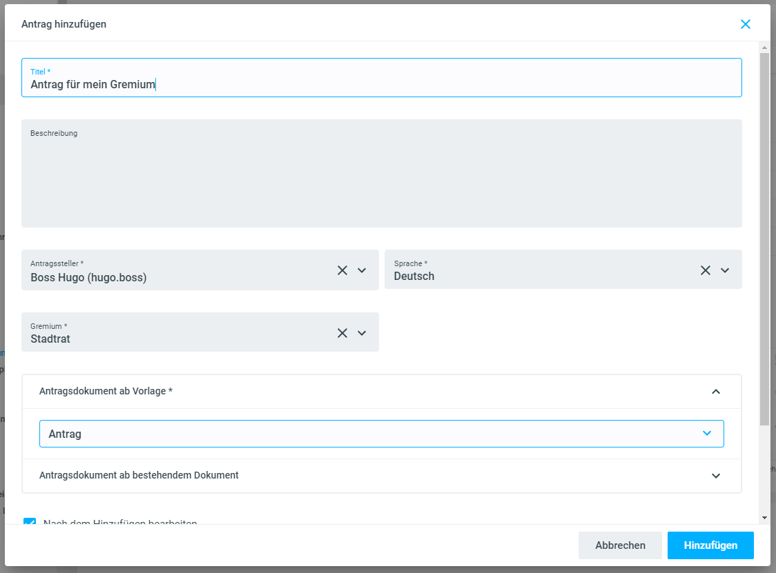 Wählen Sie das + im zugehörigen Dossier, aus dem Sie den Antrag erstellen möchten und klicken Sie auf Antrag. Anschliessen füllen Sie die obligatorischen Felder für den Antrag aus, insbesondere den Titel, das gewünschte Gremium und das zu verwendende Antragsdokument ab Vorlage. Bei Bedarf können Sie dem Antrag auch Beilagen hinzufügen.