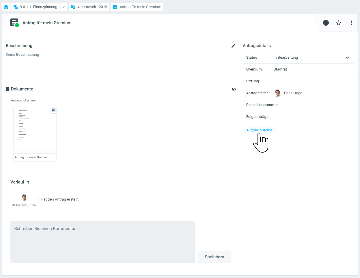 Anschliessend öffnet sich die Antragsübersicht. Daraus können Sie - falls gewünscht - eine Aufgabe erstellen.