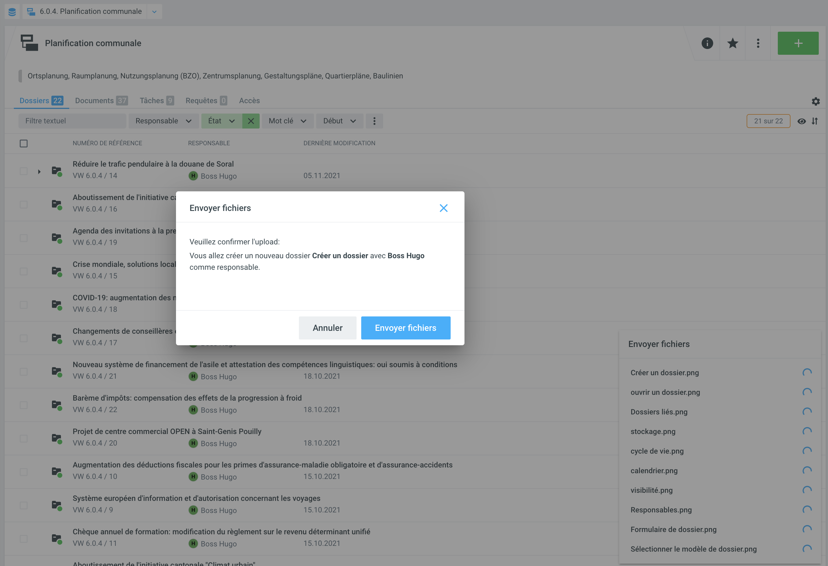 Si vous souhaitez placer des documents du système de fichiers dans un dossier, il suffit de les faire glisser dans le dossier à l'aide de la fonction "glisser-déposer". Vous pouvez également classer des dossiers entiers (y compris les sous-dossiers) par glisser-déposer. Pour ce faire, vous pouvez faire glisser le dossier sur la rubrique ouverte (= position la plus basse dans le système de dossiers). Le nom du dossier est défini comme le titre du dossier, la personne réalisant l'action comme la personne responsable.