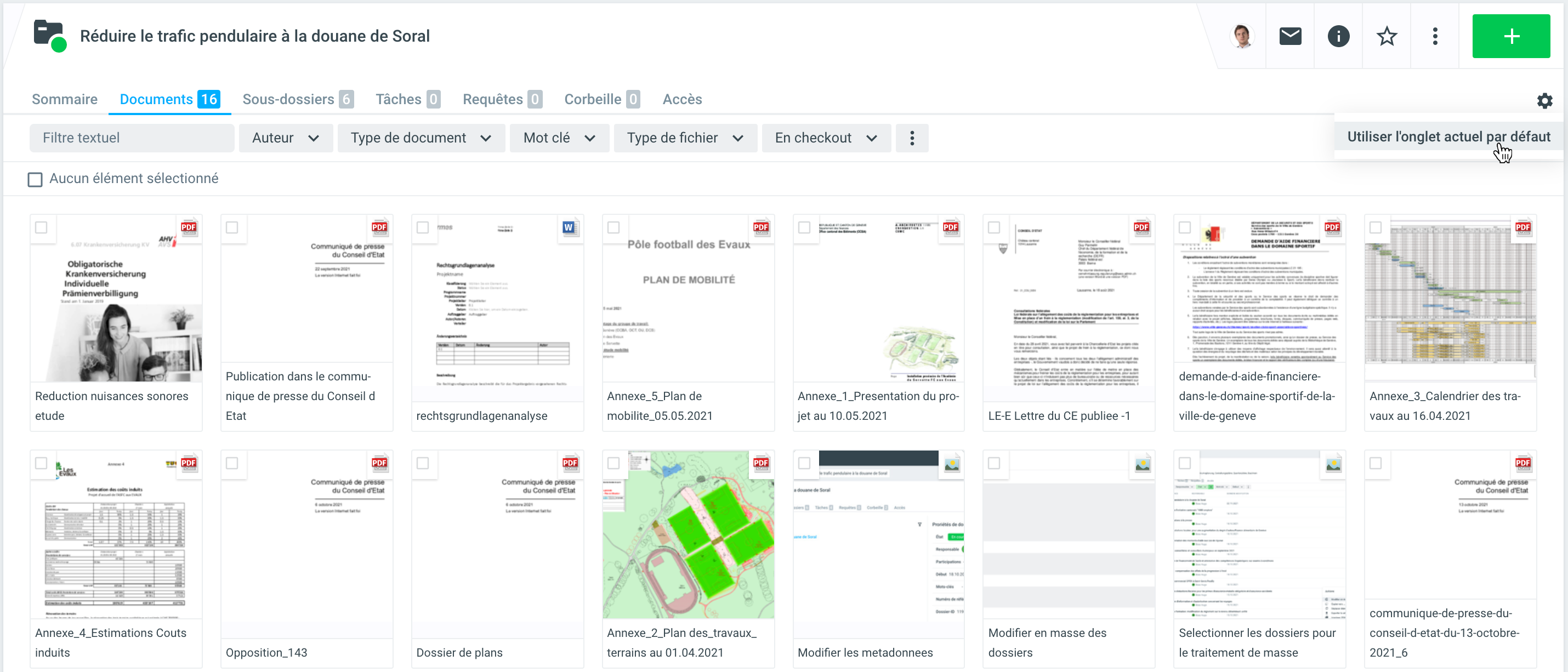 Enter: Les actions telles que l'ouverture d'un dossier peuvent être complétées avecEnter.Utilisez plusieurs onglets : Nous recommandons d'utiliser un onglet séparé dans le navigateur pour chaque dossier afin de faciliter le travail parallèle dans plusieurs dossiers. Voici les raccourcis pour y parvenir :
