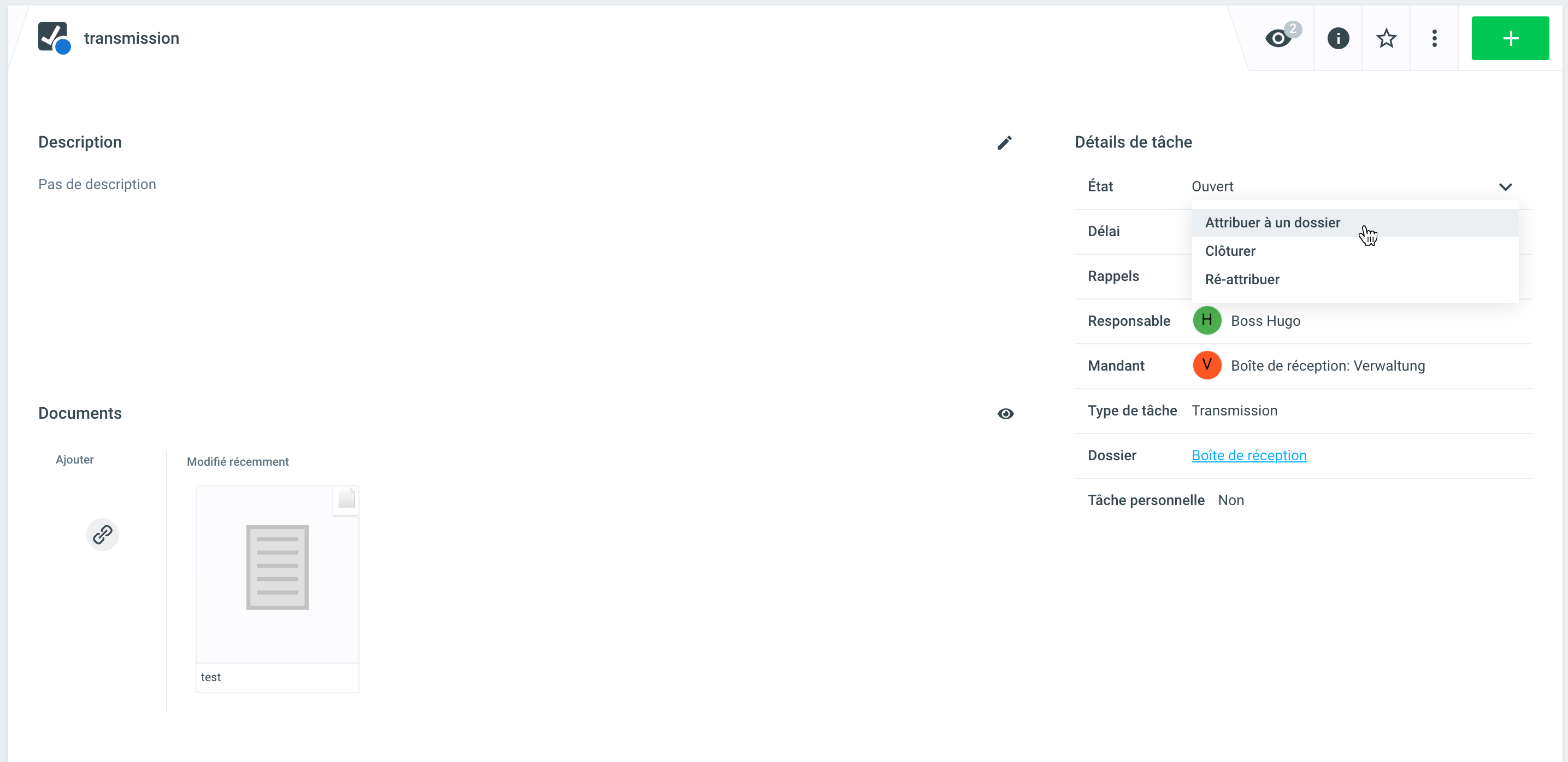 Grâce au transfert, une tâche a été générée à partir de la boîte de réception. Cette tâche peut désormais être affectée à un nouveau dossier ou à un dossier existant. Pour ce faire, ouvrez la tâche et cliquez sur le menu déroulant dans l'état de cette tâche (ou du transfert) et sélectionnez la commande Attribuer à un dossier.