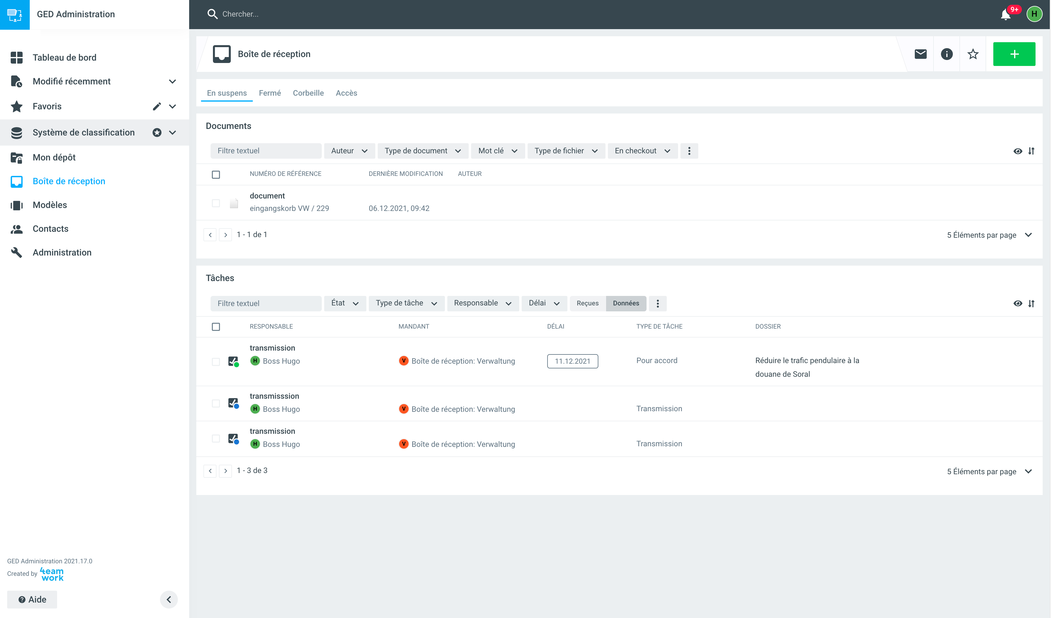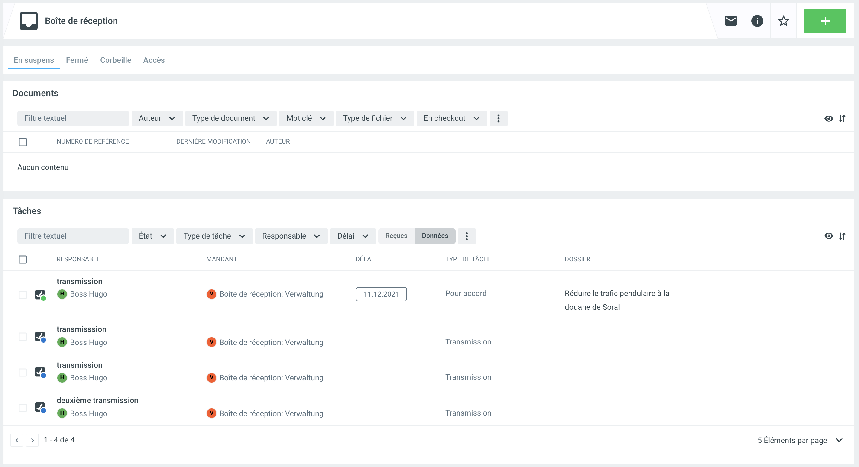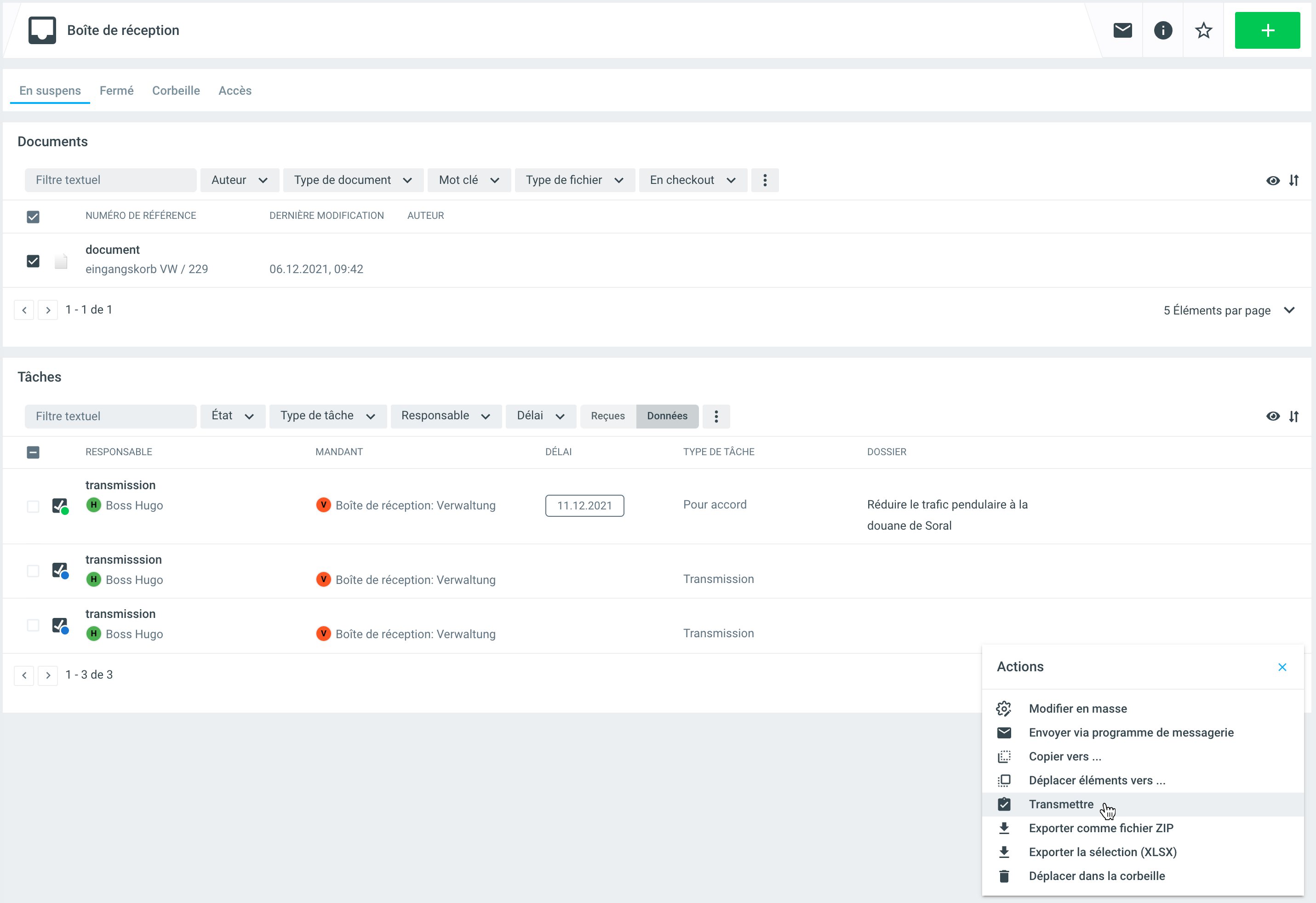 Après la sauvegarde, le transfert apparaît dans la boîte de réception du donneur d'ordre dans la liste des tâches du filtre Données. Pour le mandataire, le transfert apparaît dans sa boîte de réception dans la liste des tâches sous le filtre Reçues.
