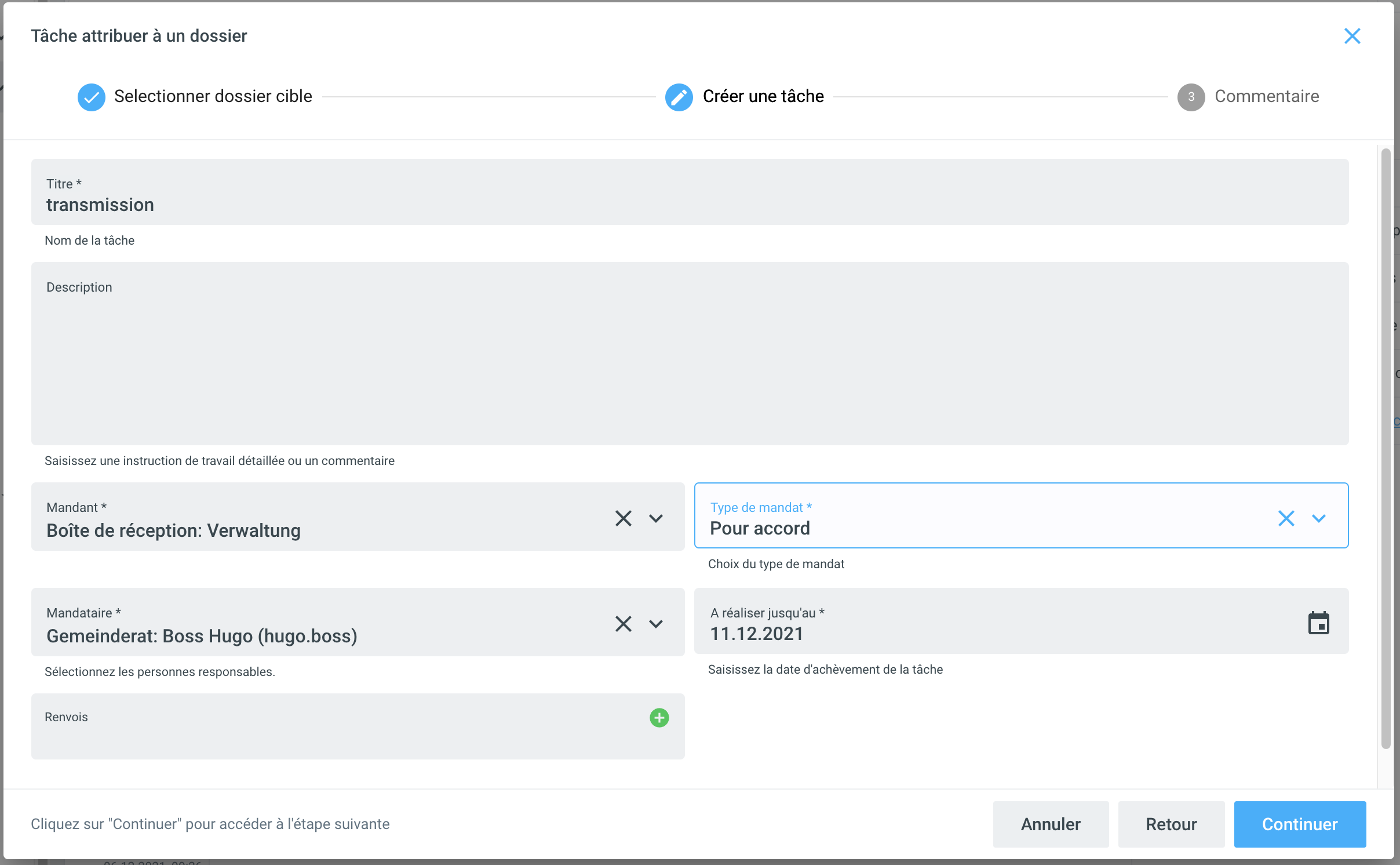 Une tâche est alors automatiquement créée à partir du transfert. Attribuez-la à un mandataire en conséquence et sélectionnez le type de tâche.