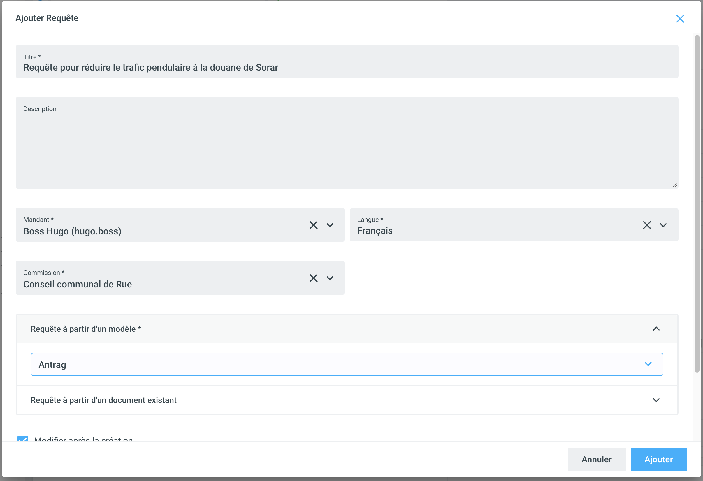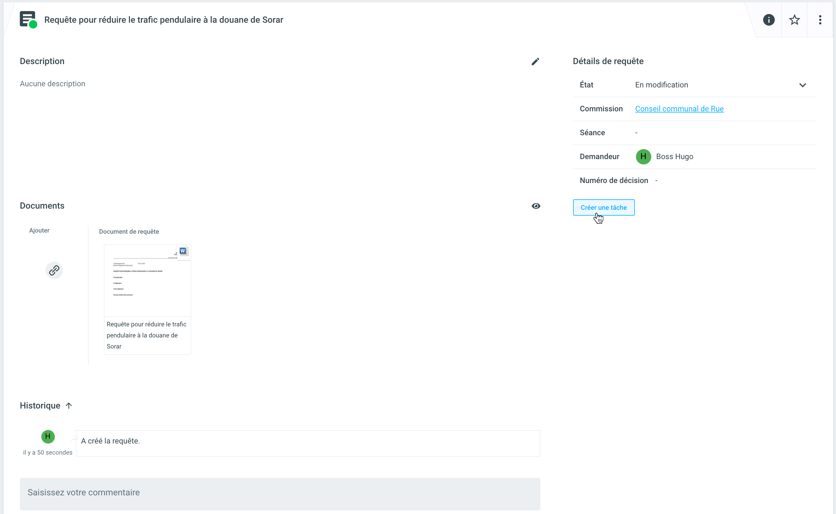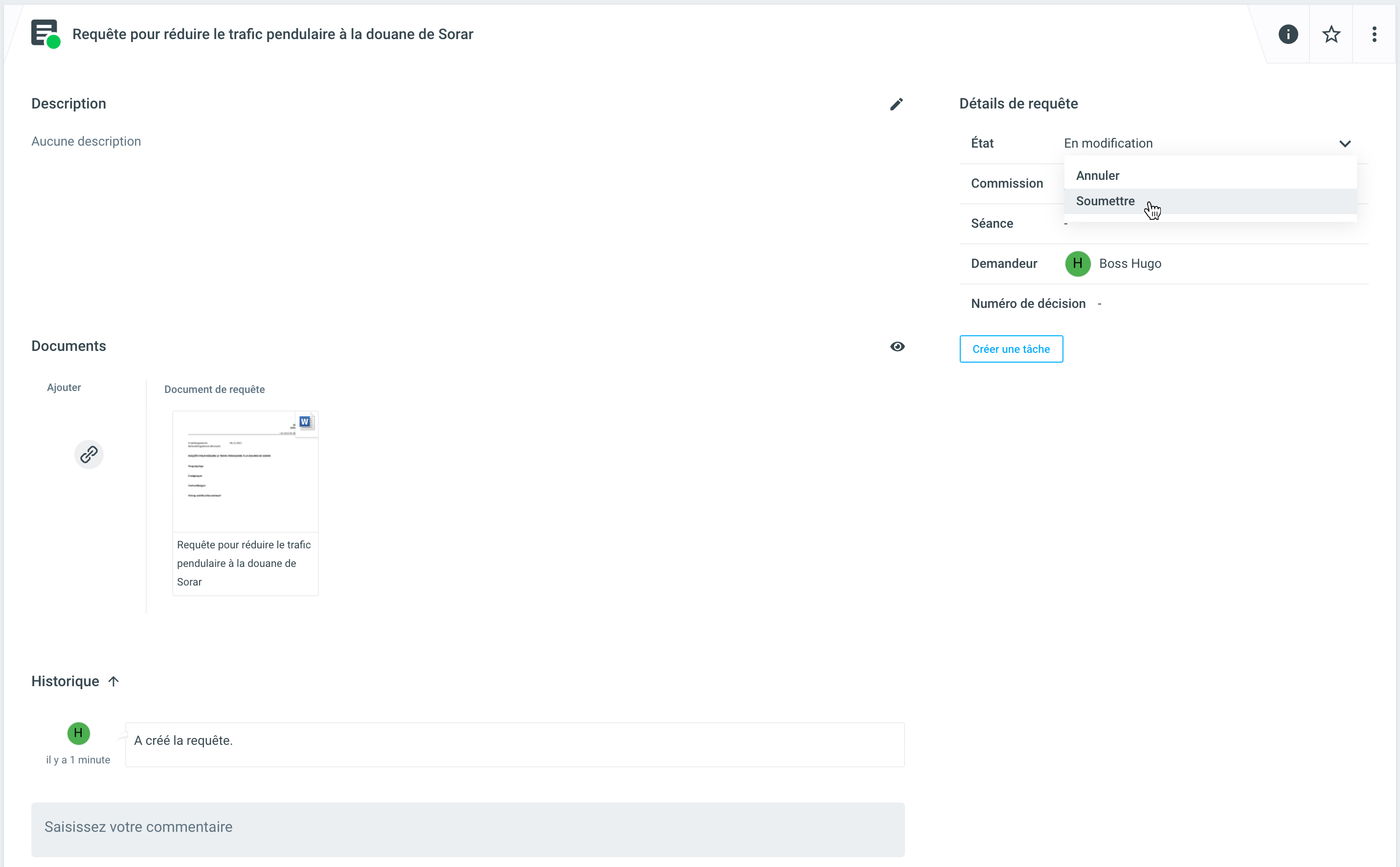 Sélectionnez le + du dossier connexe à partir duquel vous voulez créer la requête et cliquez sur requête. Remplissez ensuite les champs obligatoires de la requête, notamment le titre, le corps du texte souhaité et le document de requête à utiliser à partir du modèle. Si nécessaire, vous pouvez également ajouter des pièces jointes à la proposition.