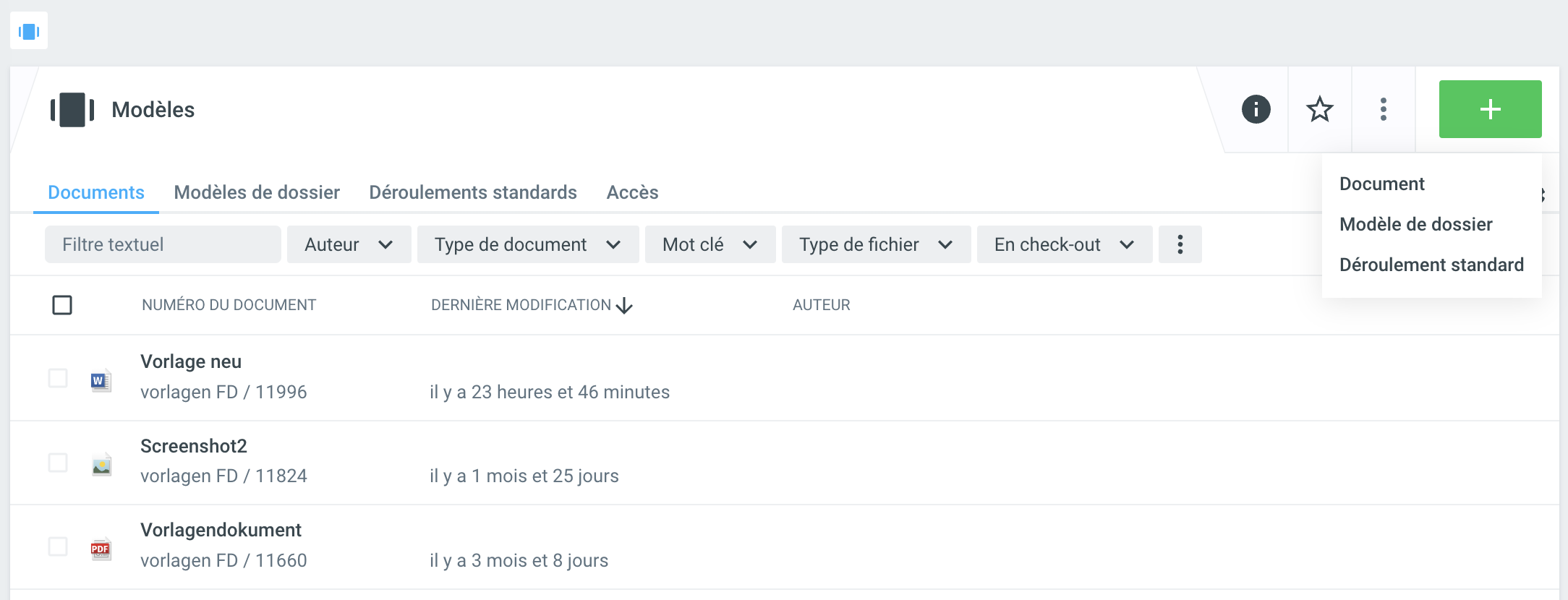 La création et la modification des déroulements standard sont réservées aux utilisateurs autorisés à gérer les modèles. Souvent, ce sont aussi les administrateurs. Vous trouverez plus d'informations sur la création et l'édition des Déroulement standards sous Gérer les modèles .
