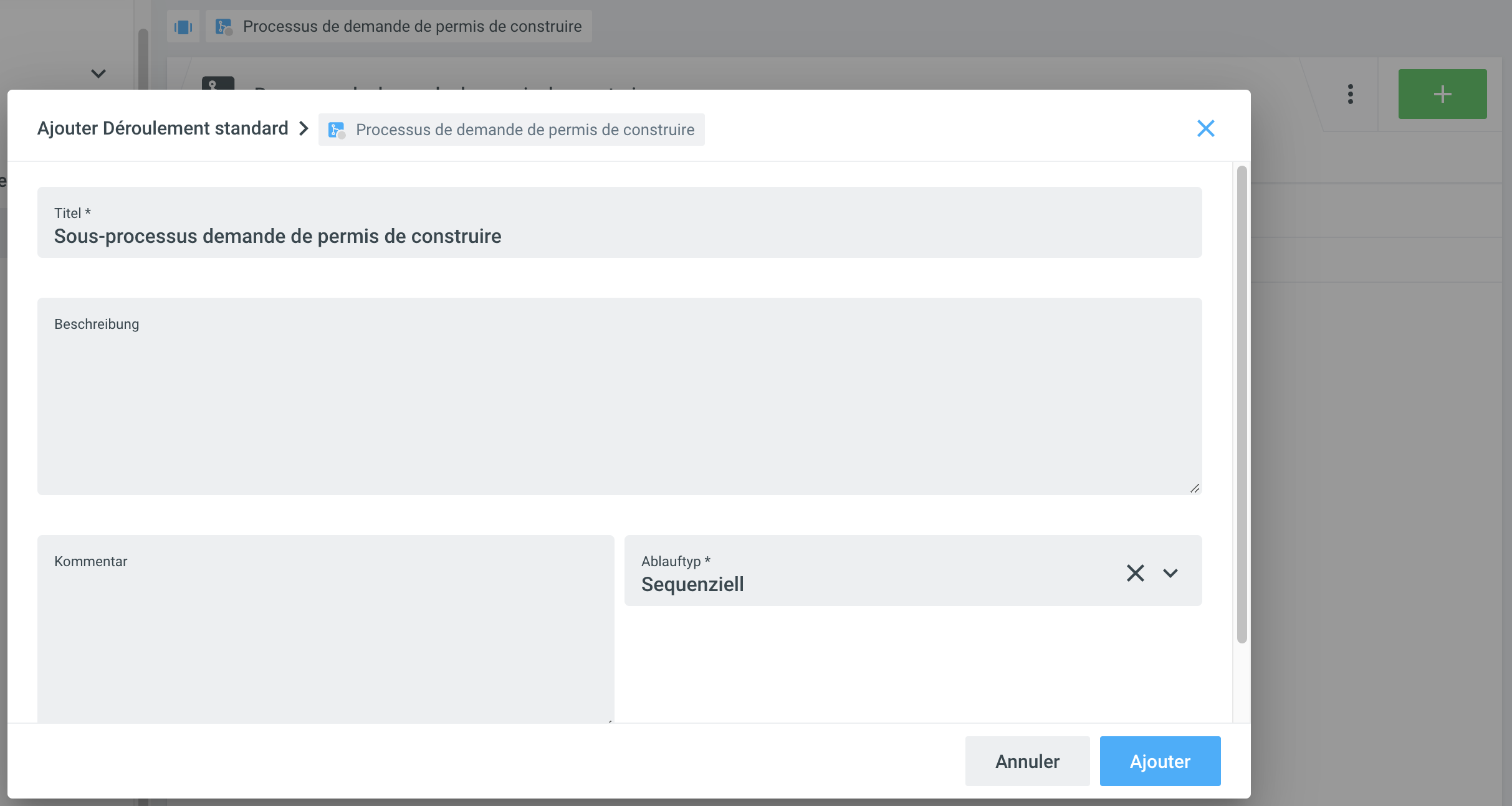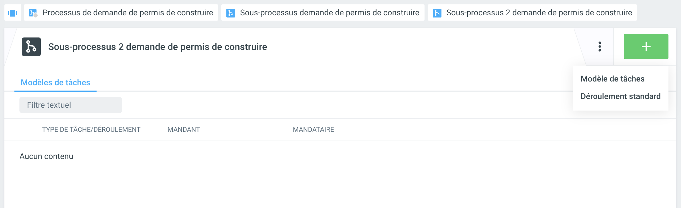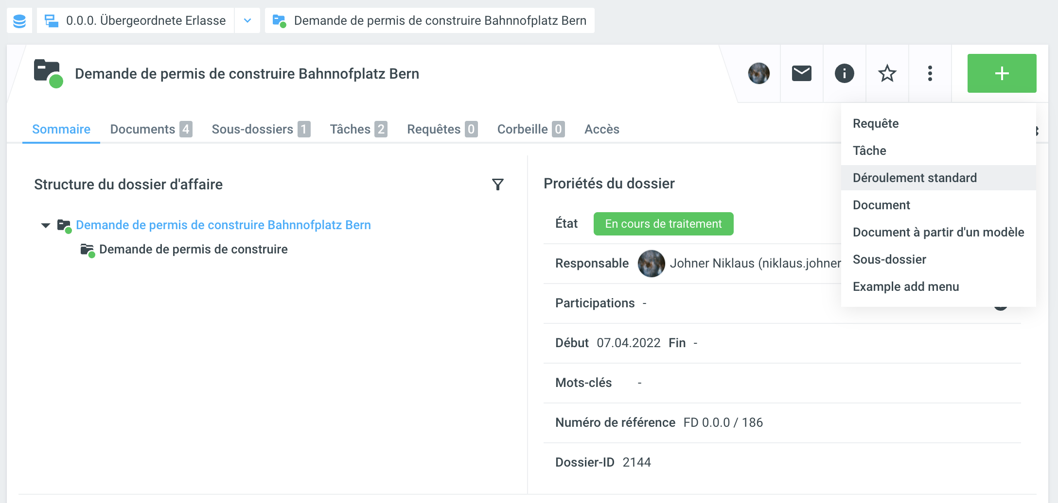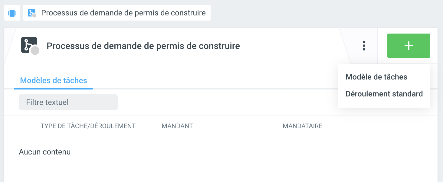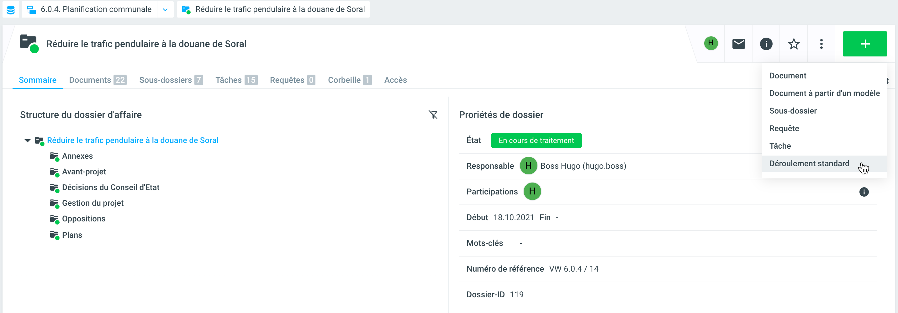 Dès qu'un déroulement standard imbriqué a été créé, il peut être utilisé dans le dossier en cliquant sur +