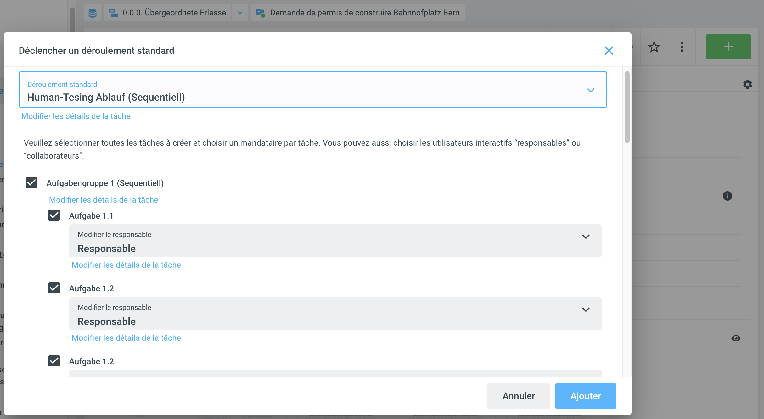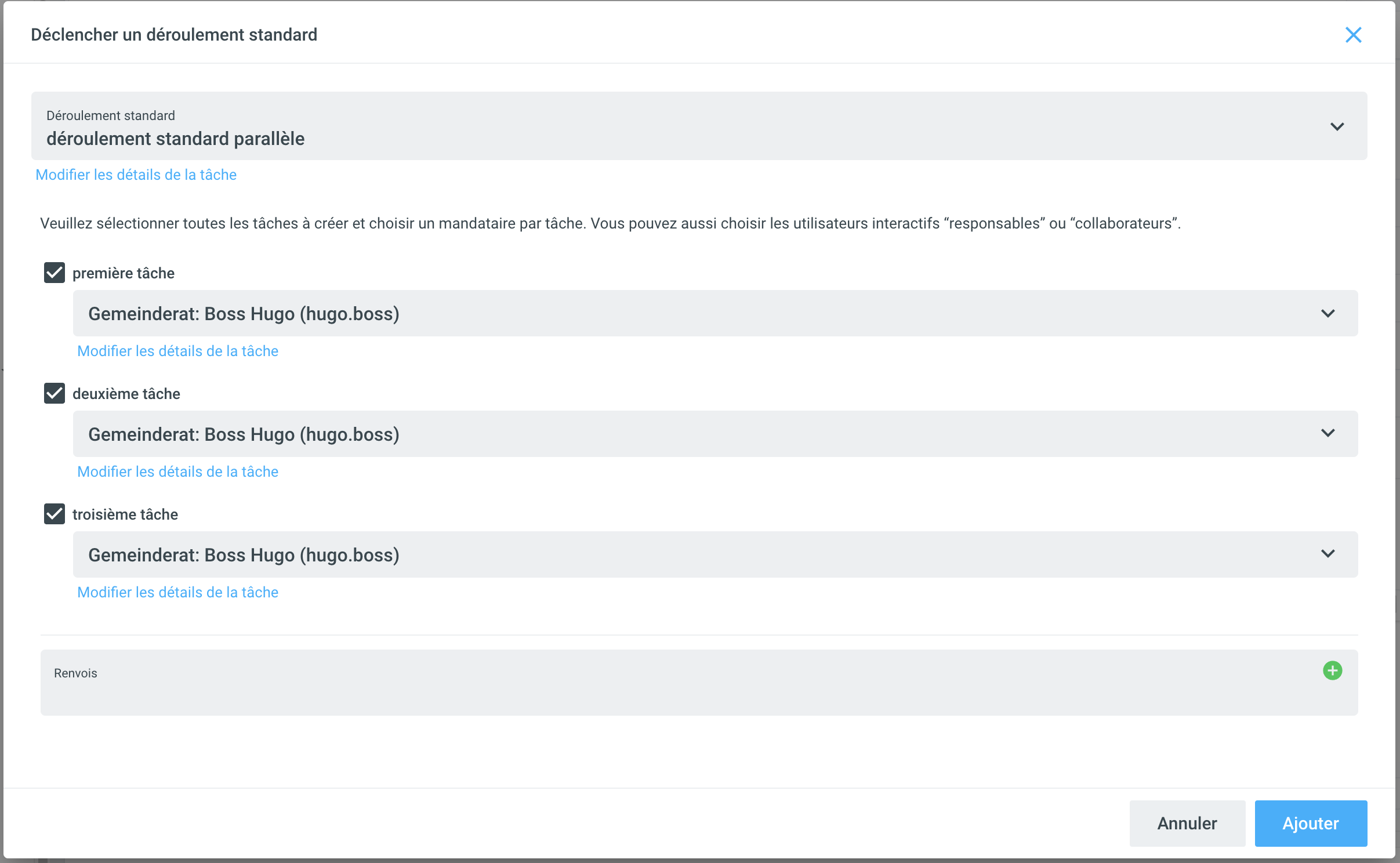 Dans une étape ultérieure, les mandataires des différentes tâches doivent être définis. Si le modèle de tâche contient déjà une proposition pour le mandataire, celle-ci s'affiche directement. Si le champ est vide, il faut d'abord saisir un mandataire. En cliquant sur Ajuster les détails de la tâche, vous pouvez encore ajuster la tâche (par exemple, la description ou le délai: Tâches). À partir de là, les différences entre un processus parallèle et un processus séquentiel deviennent claires, notamment en ce qui concerne l'état.