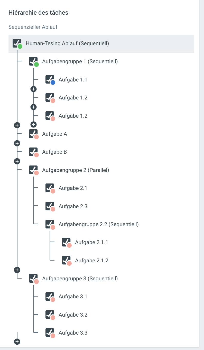 Dans la vue de la tâche principale d'un déroulement standard séquentiel, une nouvelle tâche peut être ajoutée directement à la liste des sous-tâches en cliquant sur le + dans le déroulement standard. Cela signifie que le déroulement standard peut être complété individuellement. La nouvelle tâche est alors automatiquement insérée dans le déroulement standard.