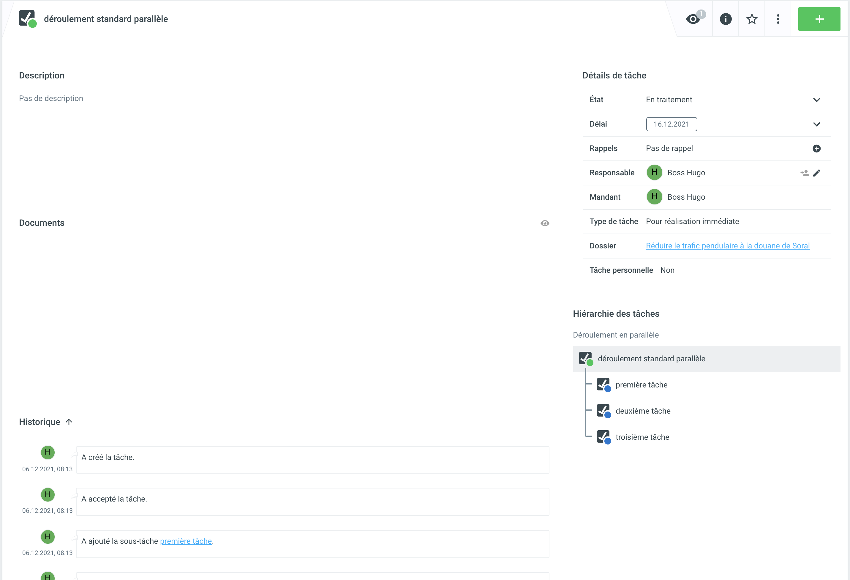 Lorsqu'une séquence standard parallèle est déclenchée, une tâche principale avec plusieurs sous-tâches est créée. La tâche principale montre qu'il s'agit d'un processus standard parallèle. Si un processus standard parallèle est déclenché, toutes les tâches passent automatiquement au statut Ouvert et sont donc prêtes pour un traitement simultané.