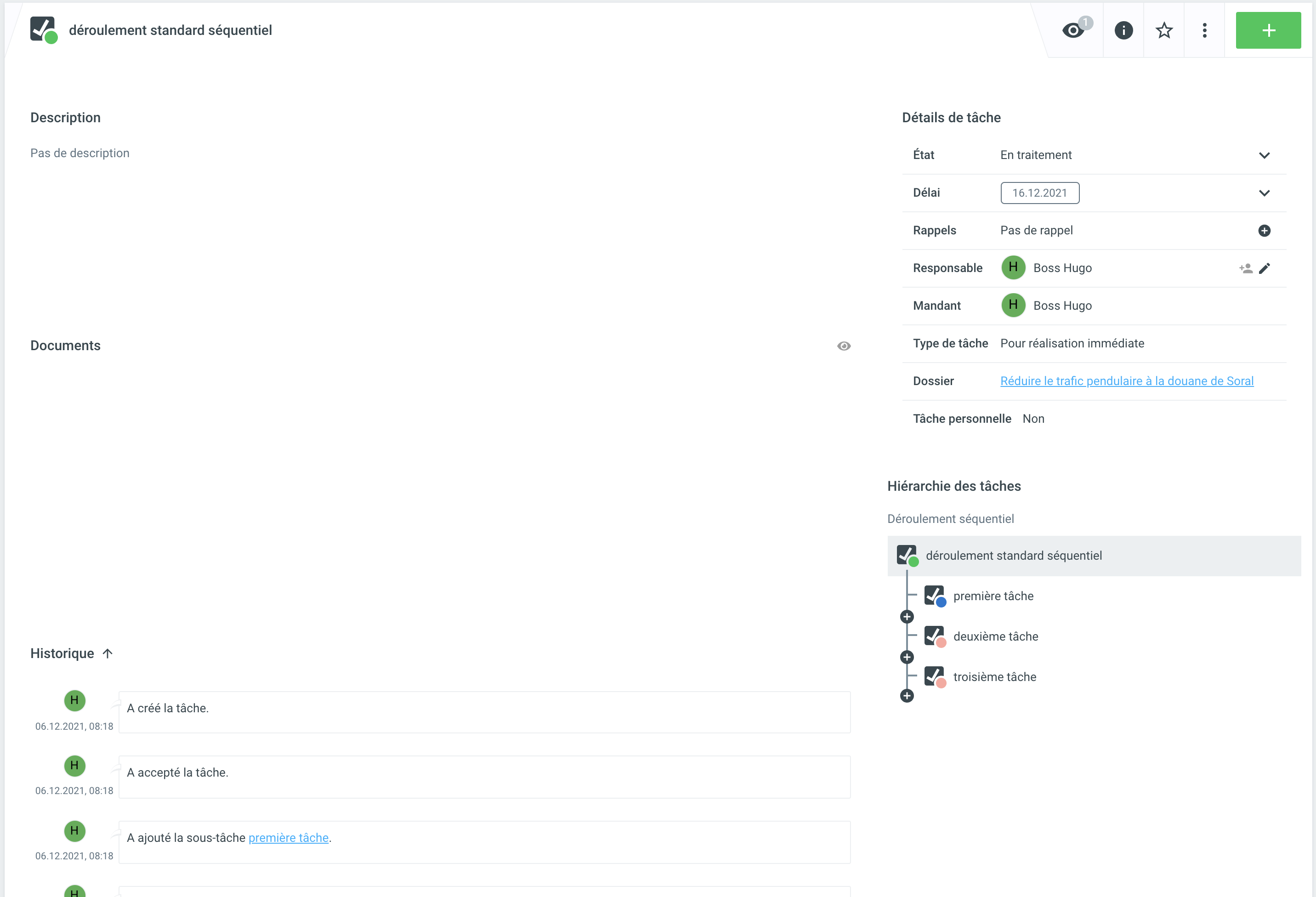 Lorsqu'un déroulement standard séquentiel est déclenché, une tâche principale avec plusieurs sous-tâches est également créée. La tâche principale montre qu'il s'agit d'un déroulement standard séquentiel. Si un déroulement standard séquentiel est déclenché, la première tâche du processus est automatiquement ouverte, toutes les autres sont initialisées dans l'état Planifié. Les tâches planifiées sont visibles, mais ne sont pas répertoriées comme étant en attente. Si une tâche est terminée, la tâche suivante dans la séquence est automatiquement ouverte ou mise au statut Ouvert et donc visible.