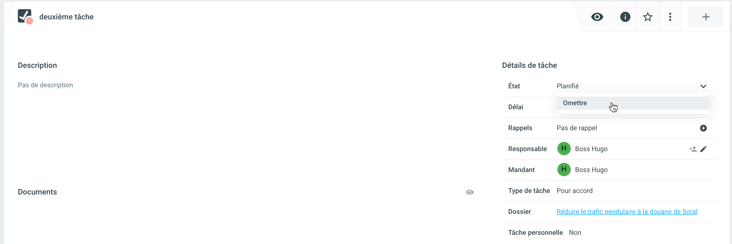Si une tâche est rejetée, elle est attribuée au mandant. Le principal a la possibilité de rouvrir la tâche (puis de la réaffecter ou de la terminer).