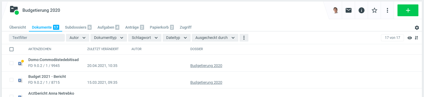 Die Dokumente in einem Dossier werden standardmässig zusammen mit den wichtigsten Metadaten aufgelistet.