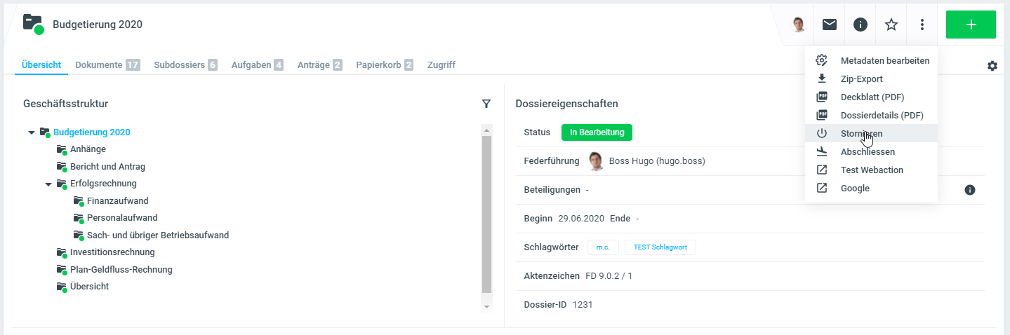 Wurde ein Dossier versehentlich eröffnet, kann es mittels Klick auf die drei Punkte (=Weitere Aktionen) und anschliessend auf Stornieren storniert werden. Stornierte Dossiers können nicht mehr bearbeitet werden. Personen mit mit entsprechender Berechtigung können stornierte Dossiers wieder aktivieren.