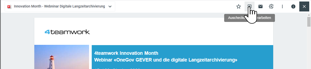 Ein Dokument auschecken und bearbeiten können Sie mittels Klick auf das Rechtecksymbol mit Pfeil (Auschecken und Bearbeiten).