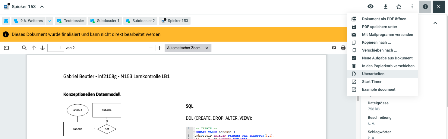 Wieder mithilfe über die drei Punkte kann die Option Überarbeiten ausgewählt werden. Somit wird das Dokument in den gewohnten Status versetzt, wo die gewohnte Bearbeitung und Anpassung möglich ist.