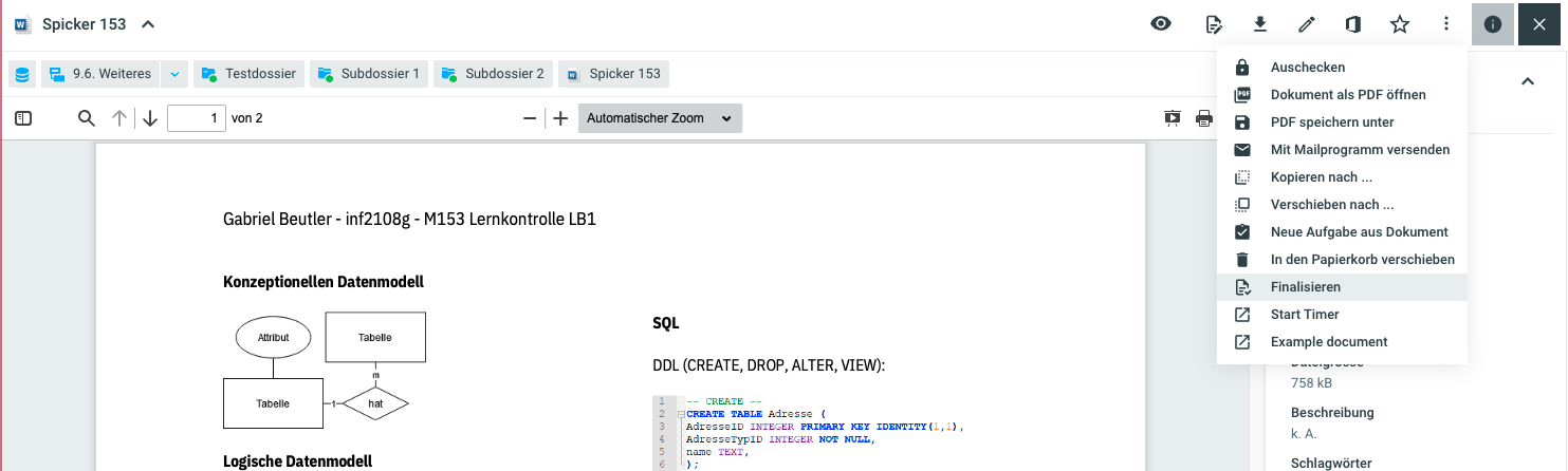 Nachdem ein Dokument bearbeitet und wieder eingecheckt wurde, besteht die Möglichkeit das Dokument finalisieren zu können. Dieser Statuswechsel führt dazu, dass keine Bearbeitungen am Dokument mehr möglich sind. Finalisierte Dokumente können aber über die Option Überarbeiten wieder bearbeitet und angepasst werden.