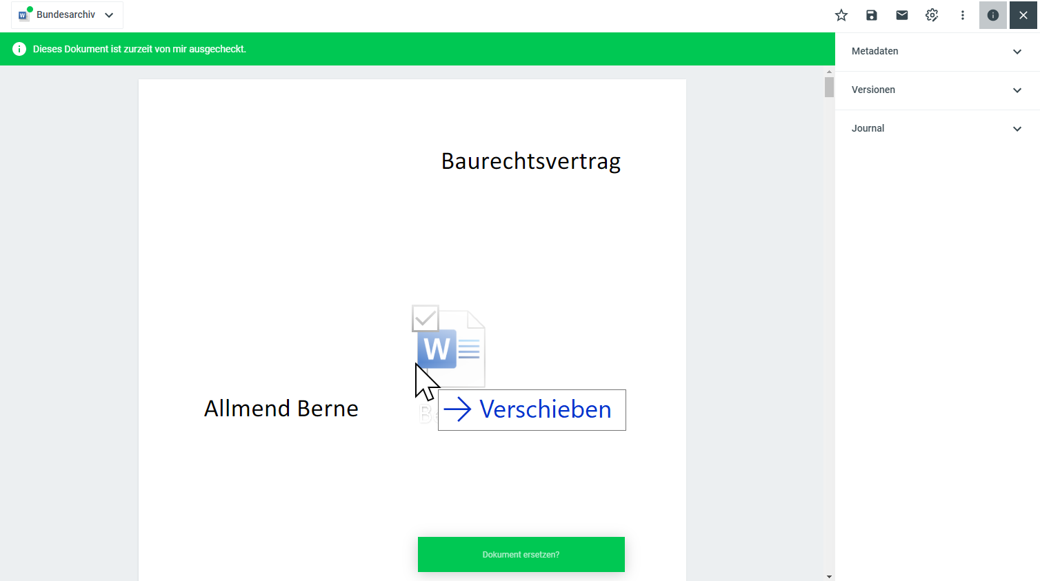Wenn Sie ein bestehendes Dokument in Fabasoft OneGov ausserhalb (z.B. lokal auf Ihrem Gerät) weiterbearbeitet haben und diese Datei nun als neue Version des bestehenden Dokuments ablegen möchten, ziehen Sie die Datei aus Ihrem Filesystem über Drag’n’Drop direkt auf die Dokumentenansicht. Im Fenster erscheint unten im Fenster eine grüne Systemmeldung Datei ersetzen?