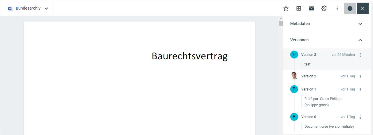 Das Dokument erscheint als eingecheckt. Die abgelegte Datei wird als neue Version in den Versionsinformationen geführt.