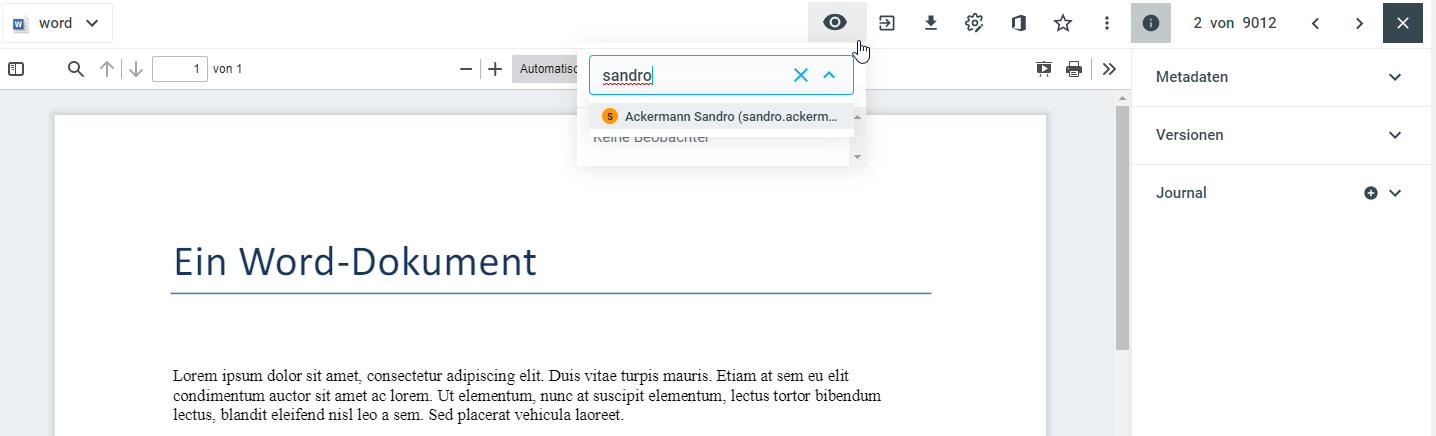 Mittels Klick auf das Augen-Symbol können Sie Personen eintragen, die das entsprechende Dokument beobachten. Wer bei dieser Funktion eingetragen ist, wird bei folgenden Änderungen an dem betreffenden Dokument benachrichtigt: