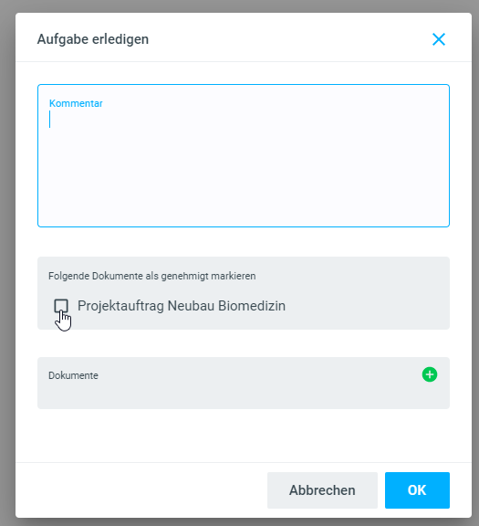 Unter Nutzung des Aufgabentyps Zur Genehmigung kann ein genehmigtes Dokument auch als solches gekennzeichnet werden. Dazu muss der Auftragnehmer bei Erledigung der Aufgabe unter Folgende Dokumente als genehmigt markieren diejenigen Dokumente selektieren, welche entsprechend markiert werden sollen.