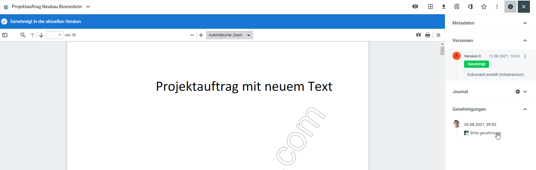 Das gewählte Dokument erhält dann eine entsprechende Kennzeichnung. Zudem ist unter i sowohl in den Versionen wie auch unter dem Reiter Genehmigungen nachvollziehbar aufgelistet, woher die Genehmigung kommt (Referenz zur Aufgabe) und welche Version des Dokuments genehmigt wurde.